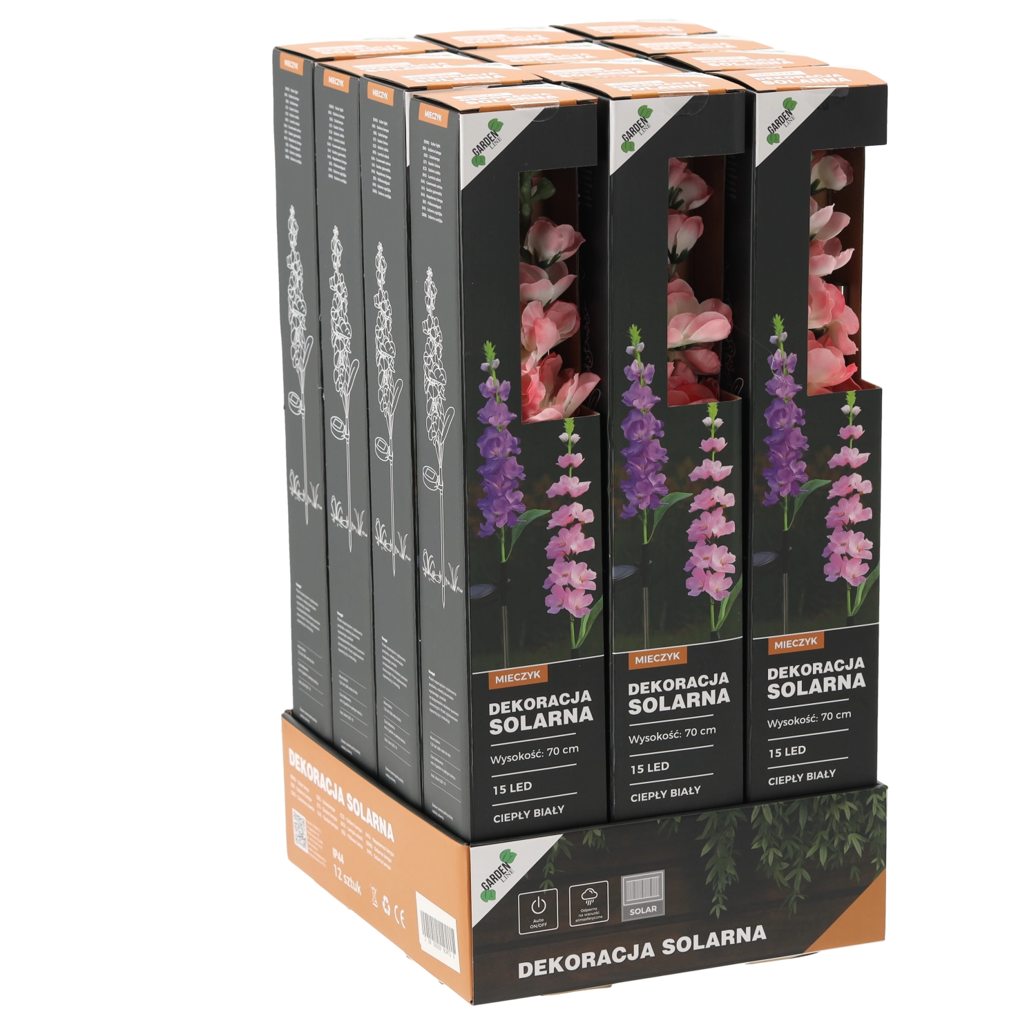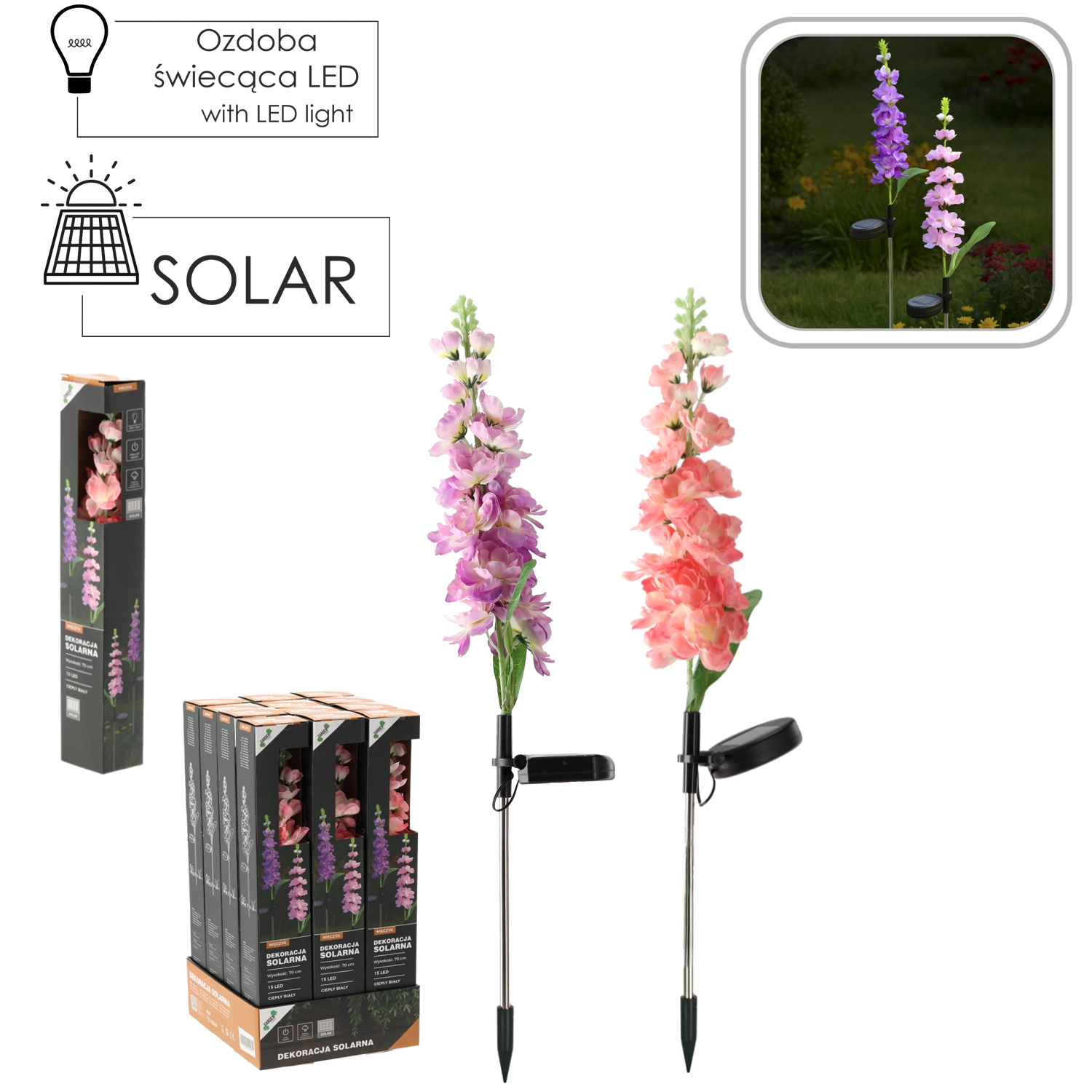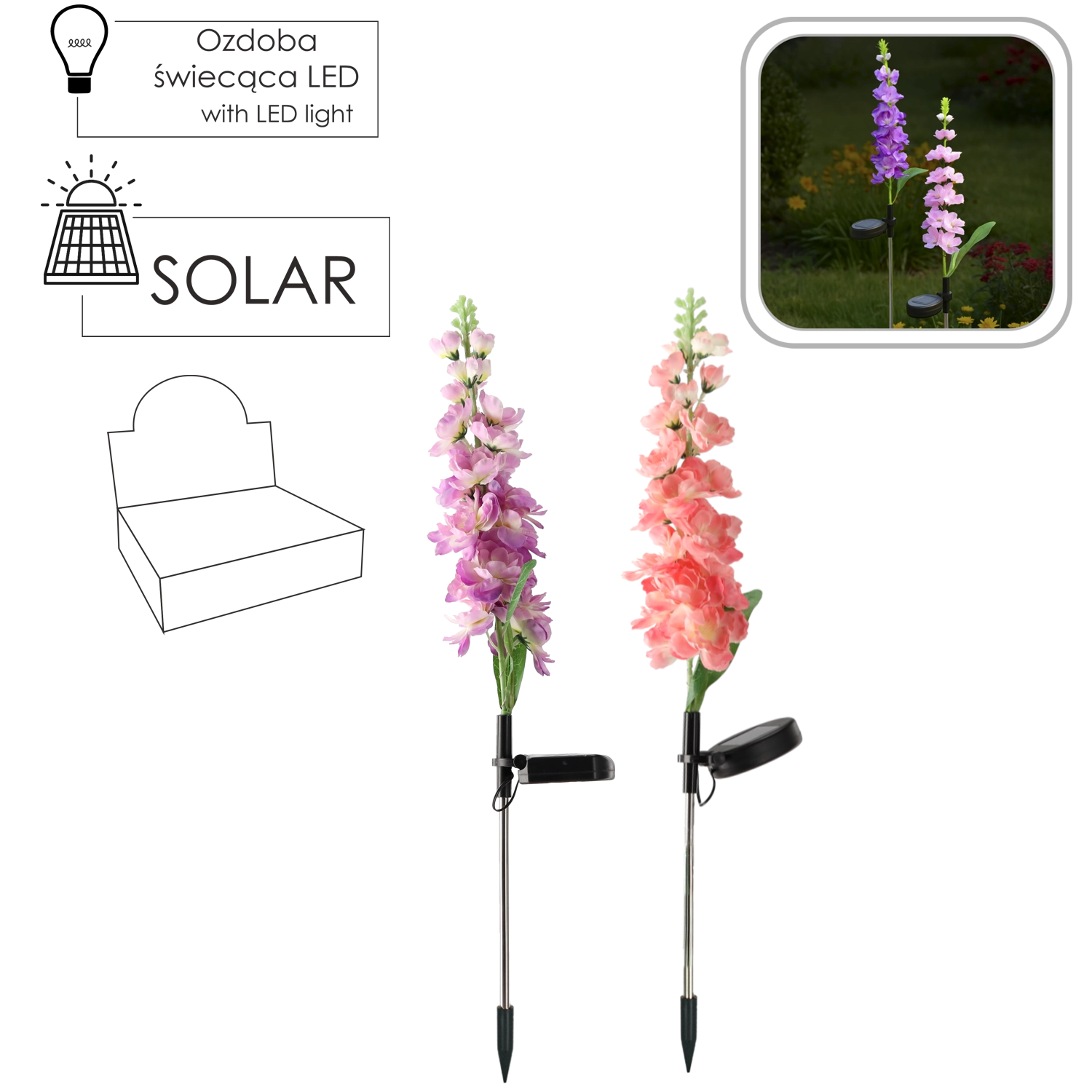 Zaradi zaščite IP44 je odporna na običajne vremenske vplive. Namestitev je preprosta – kol vzemite, ga zapičite v zemljo ali korito, vklopite in pustite na soncu. Na voljo je mešanica barv cveta: rožnata ali vijolična, ki poživi vsako gredo in zunanjo dekoracijo.
