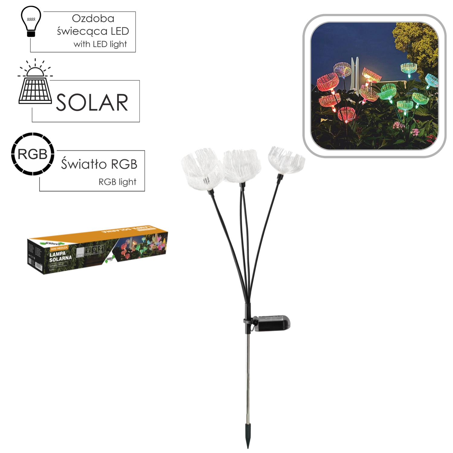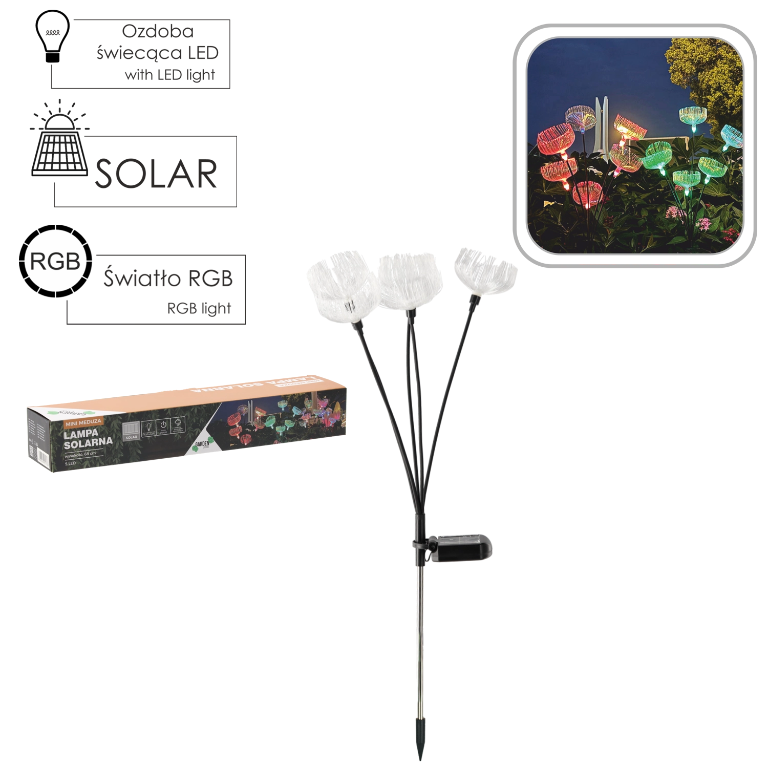 Popestrite vzdušje svojega vrta, terase ali poti z originalno sončno svetilko Meduza mini. Kombinacija 5 LED diod z menjavo barv in višine 68 cm ustvarja impresiven svetlobni učinek, ki pritegne pozornost podnevi in ponoči. Zahvaljujoč zaščiti IP44 je svetilka primerna za celoletno zunanjo uporabo.