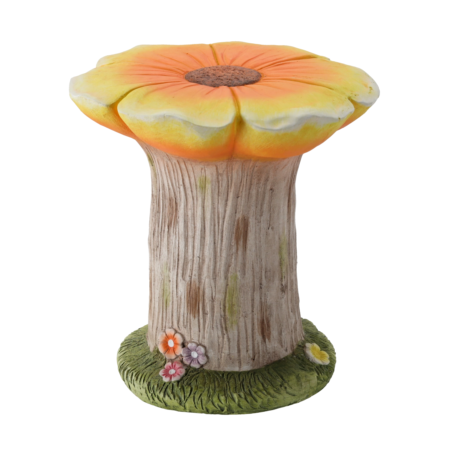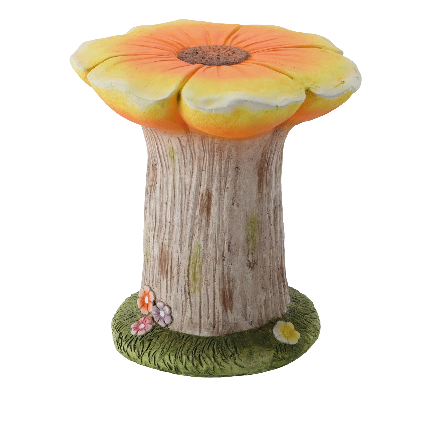 To izvirno vrtno stojalo v obliki cveta združuje estetiko in praktičnost. Realistična tekstura lesa, poslikan cvet v oranžnih tonih ter zelena osnova z drobnimi cvetovi delujejo naravno in okusno. Zahvaljujoč kompaktnim meram 31 × 30,5 × 33 cm je primerno tudi za manjše površine, kot sta balkon ali terasa.