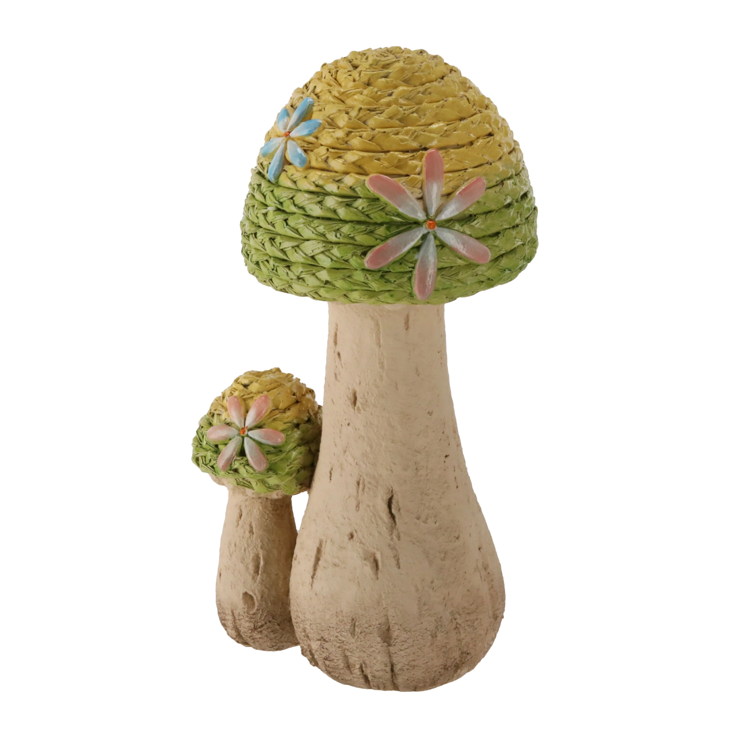 Ta elegantna vrtna figurica z motivom pletenih gob navduši z nežno teksturo in pastelnimi poudarki, ki podčrtajo njen naravni, ročno izdelan videz. Zahvaljujoč stabilni osnovi jo zlahka postavite na različne zunanje površine.