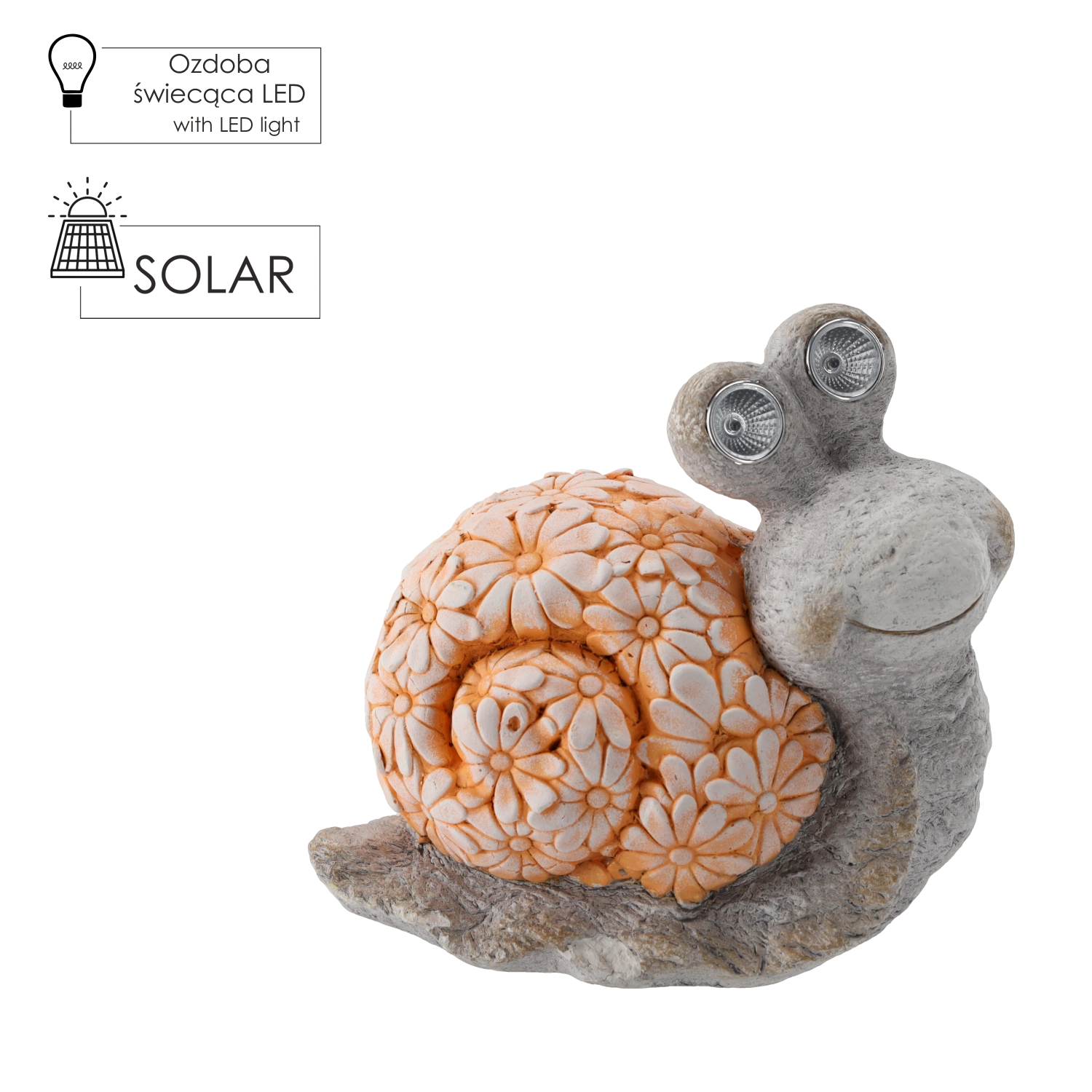 Ustvarite prijeten kotiček z dekorativnim polžem, ki čez dan črpa energijo iz solarnega panela, po mraku pa se samodejno prižge z nežno svetlobo v očeh. Realistična zasnova s cvetličnim reliefom hiška in kamnitim videzom se odlično poda med grede, ob poti ali k vodnim elementom.