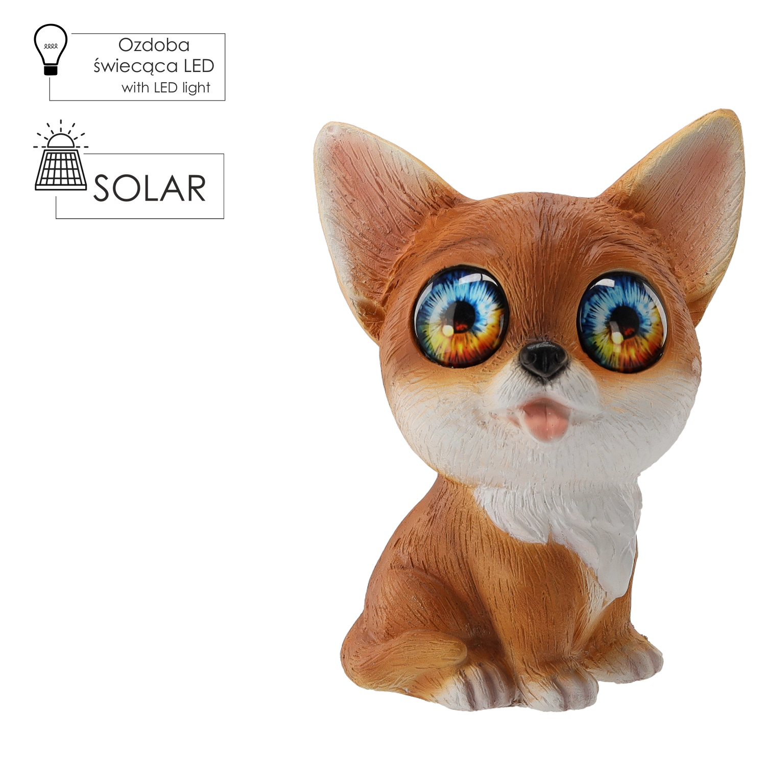 V svoj vrt vnesite pravljično vzdušje z dekorativno lisico, katere oči nežno žarijo v toplo beli svetlobi zahvaljujoč dvema vgrajenima LED diodama. Solarni panel čez dan polni vgrajeni akumulator, po temi pa se luč samodejno prižge.