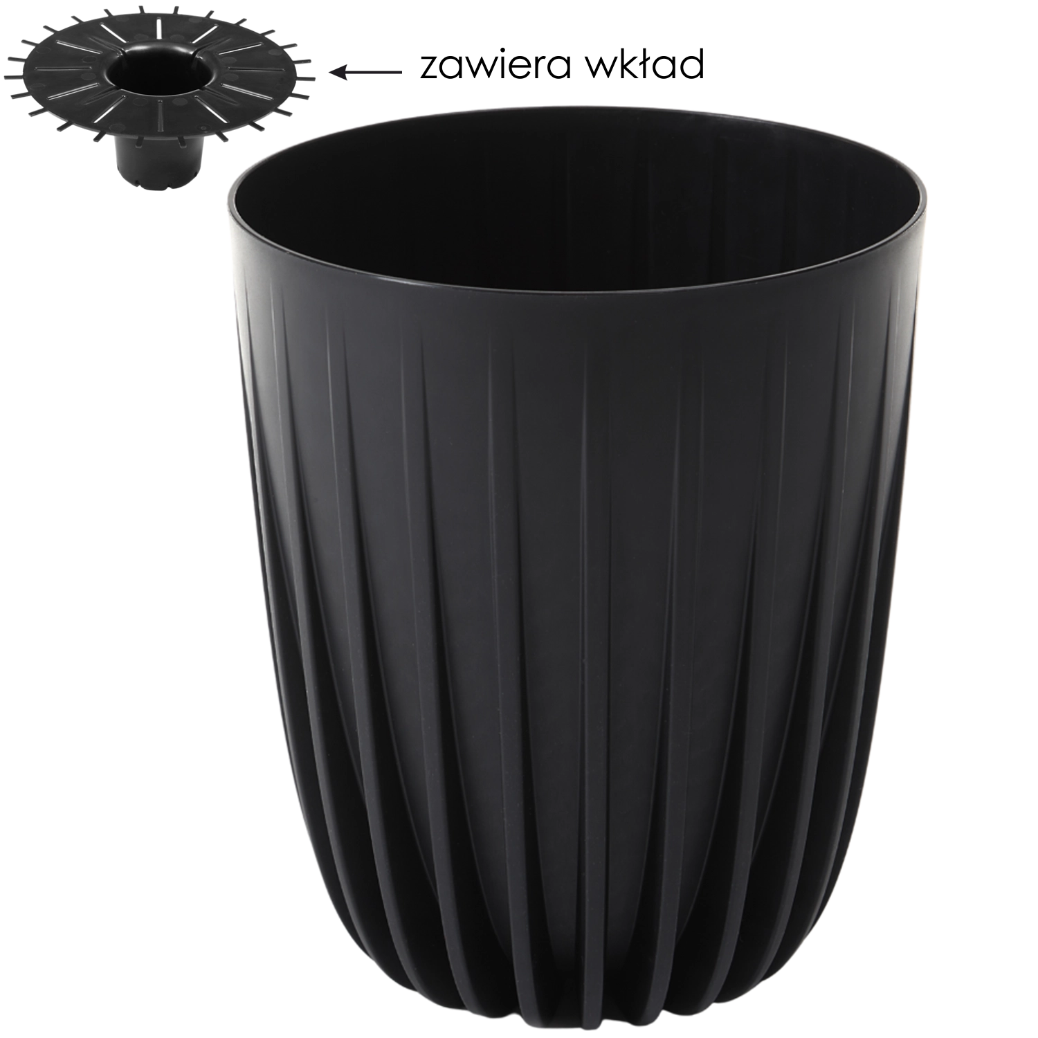 Stilski cvetočni lonček iz 100 % reciklirane plastike s premerom 39 cm v elegantni črni barvi. Zahvaljujoč matirani površini in navpičnim utorom odlično dopolni moderne in skandinavske interierje. Zožujoča se oblika deluje višje in lahkotno, priložena vložka varčuje s prstjo in podpira optimalno zalivanje. Odporen na mraz in UV-sevanje – idealen za notranje prostore ter teraso ali balkon.