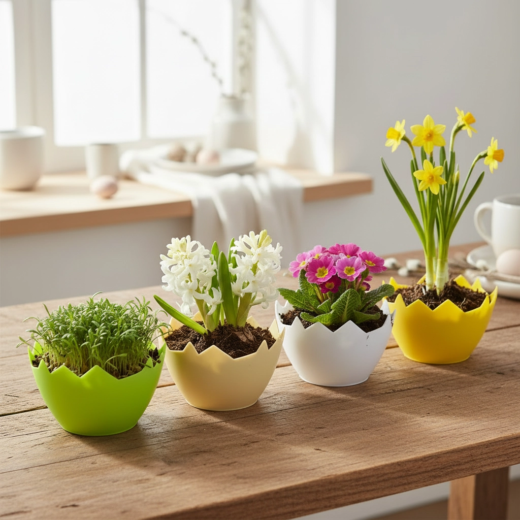 Ovitk je popoln za majhne lončke za rože, zelišča, vrtno krešo in sezonske velikonočne dekoracije. Barvna paleta v odtenkih zelene, bele, rumene in bež omogoča uskladitev dekorja v enoten slog ali ustvarjanje igrivih kontrastov.