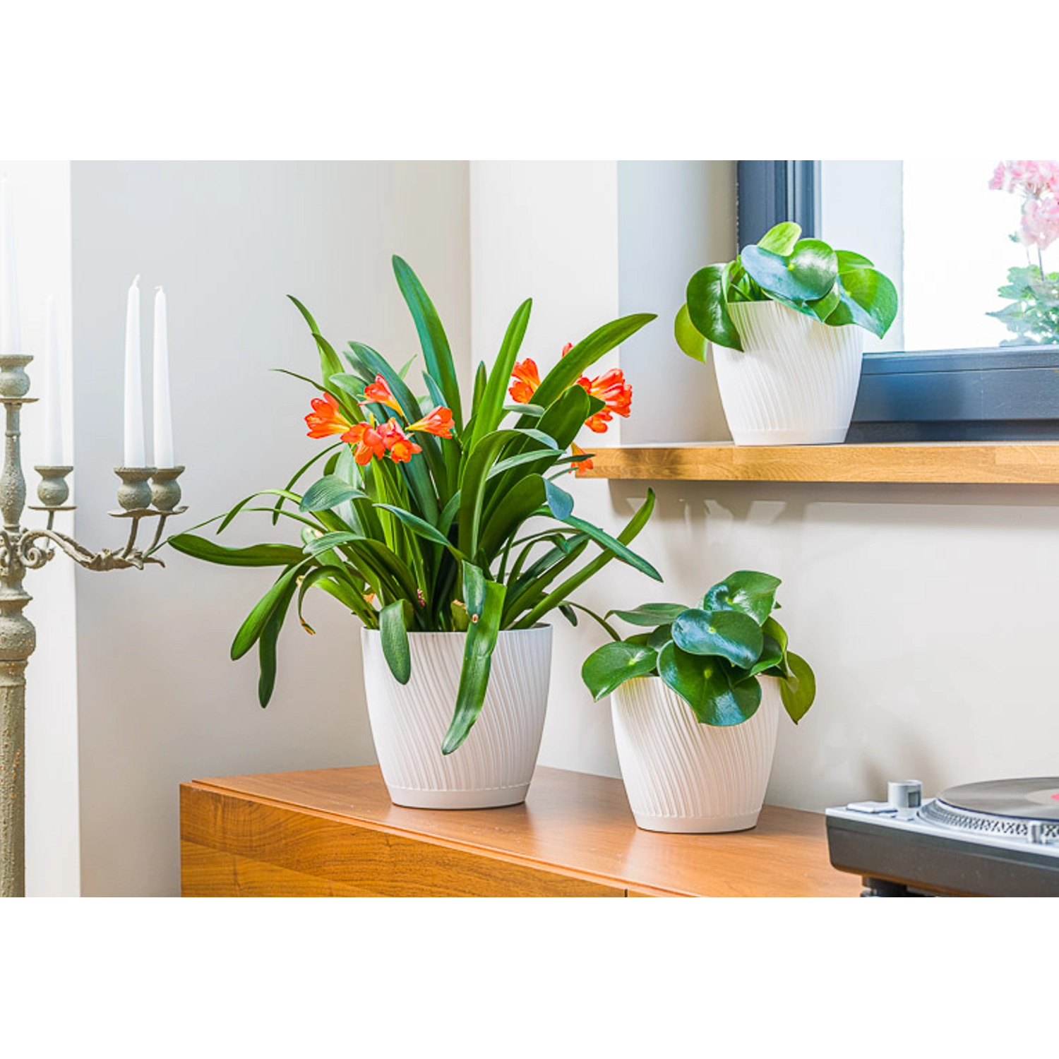 Dodajte svojim rastlinam slog in zanesljivo nego. Cvetlični lonček s podstavkom Mika Eco Recycled izstopa s čisto belo barvo in valovito teksturo, ki se odlično poda v dnevno sobo, na balkon ali na vrt. Odporna reciklirana plastika zagotavlja majhno težo, dolgo življenjsko dobo in enostavno čiščenje.