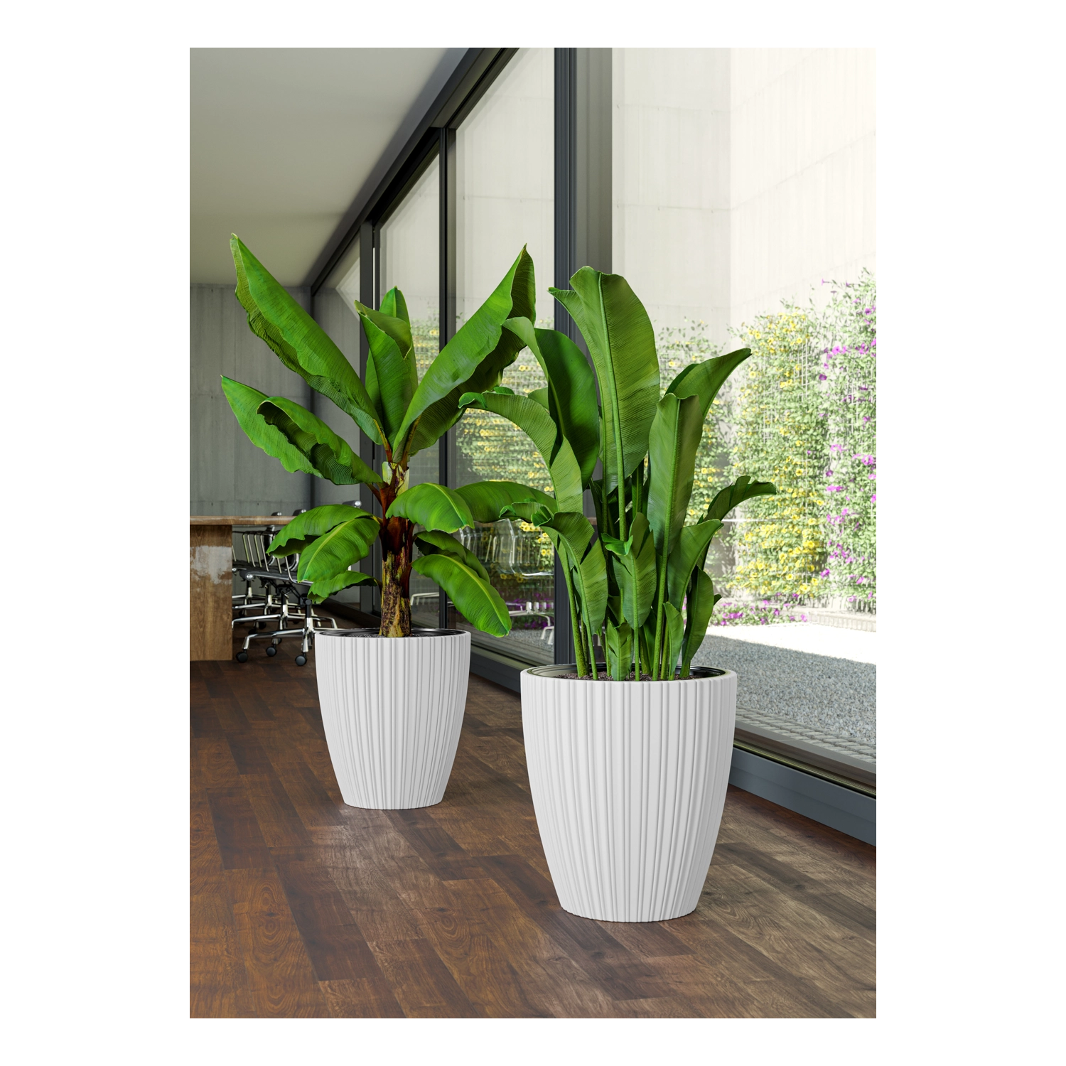 Stilski lonec za rože MIKA s premerom 30 cm v beli barvi iz kakovostne plastike z mat površino prinaša sodoben videz z izvirno reliefno teksturo. Zahvaljujoč odstranljivemu vložku z ročaji prihranite substrat in si olajšate sajenje. Odvod odvečne vode v spodnji del ustvarja idealne pogoje za rast rastlin. Lonec je primeren za notranjo in zunanjo uporabo ter odporen proti zmrzali in vremenskim vplivom za celoletno uporabo.
