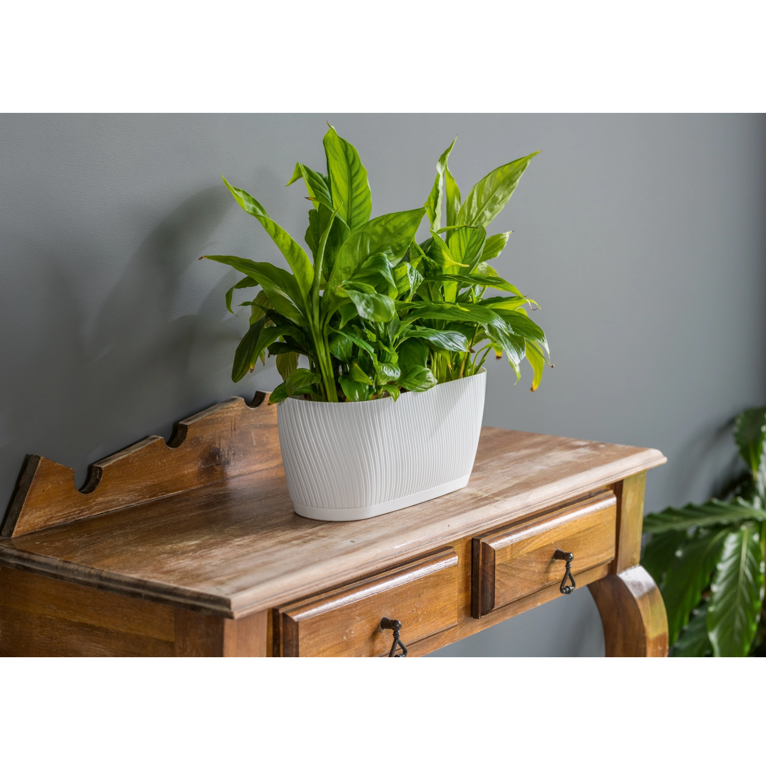 Korito MIKA 27 cm ECO Recycled v beli barvi združuje čist, moderen dizajn z nežnimi črtami in skrbnost do narave. Izdelano iz reciklirane plastike, ponuja dolgo življenjsko dobo in nizko težo, zato je enostavno za prenašanje in čiščenje. Vgrajeni podstavek izboljšuje nego rastlin in ohranja okolne površine suhe.
