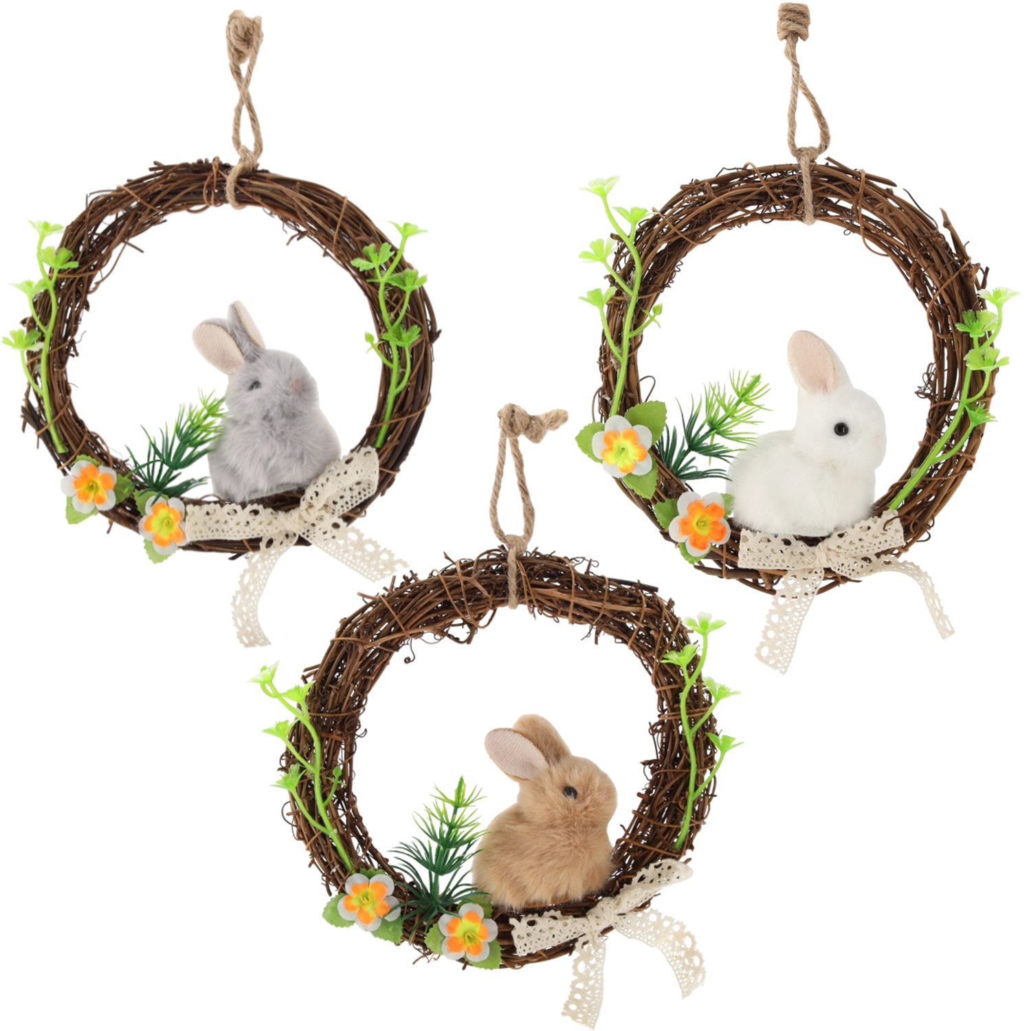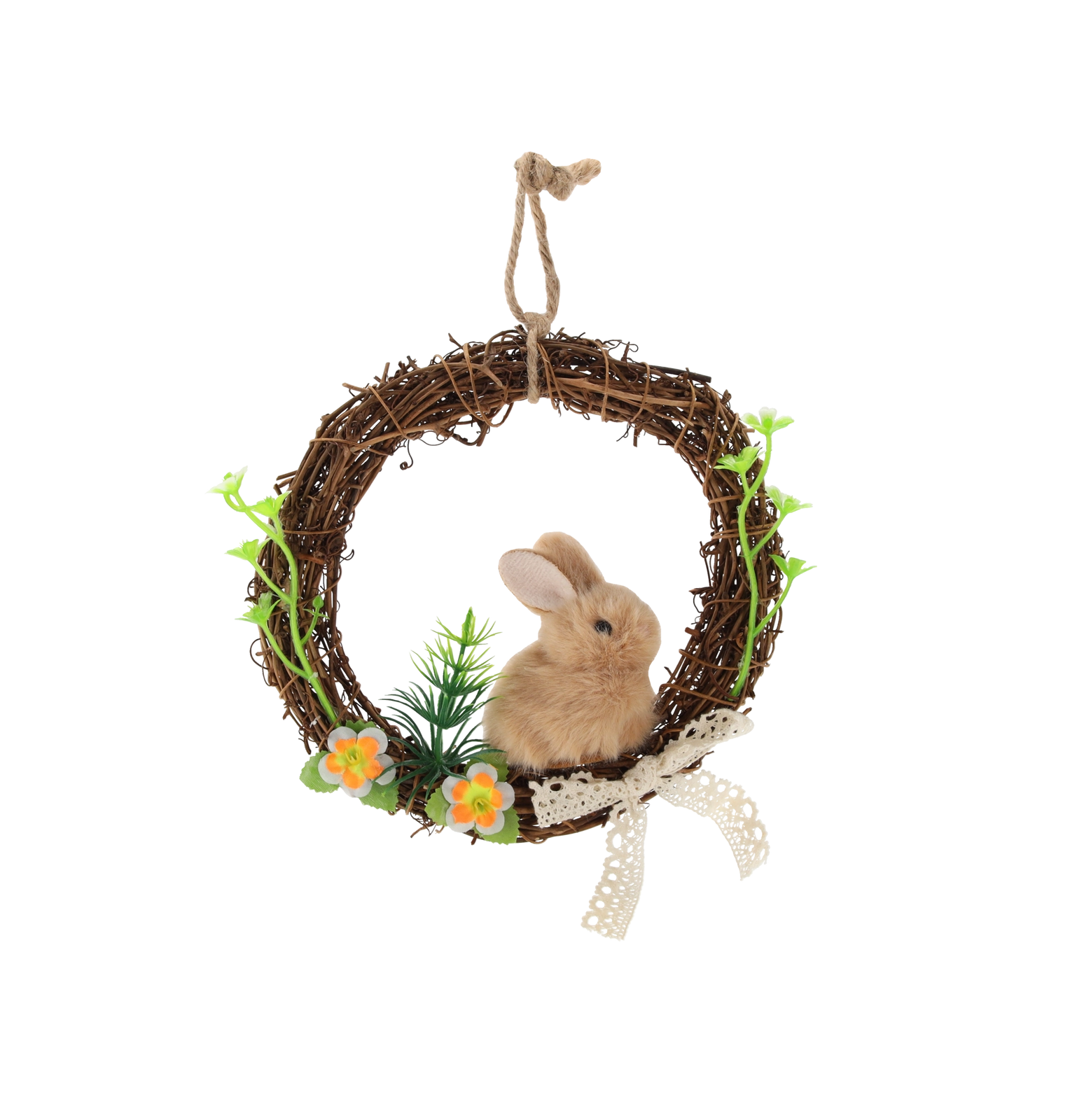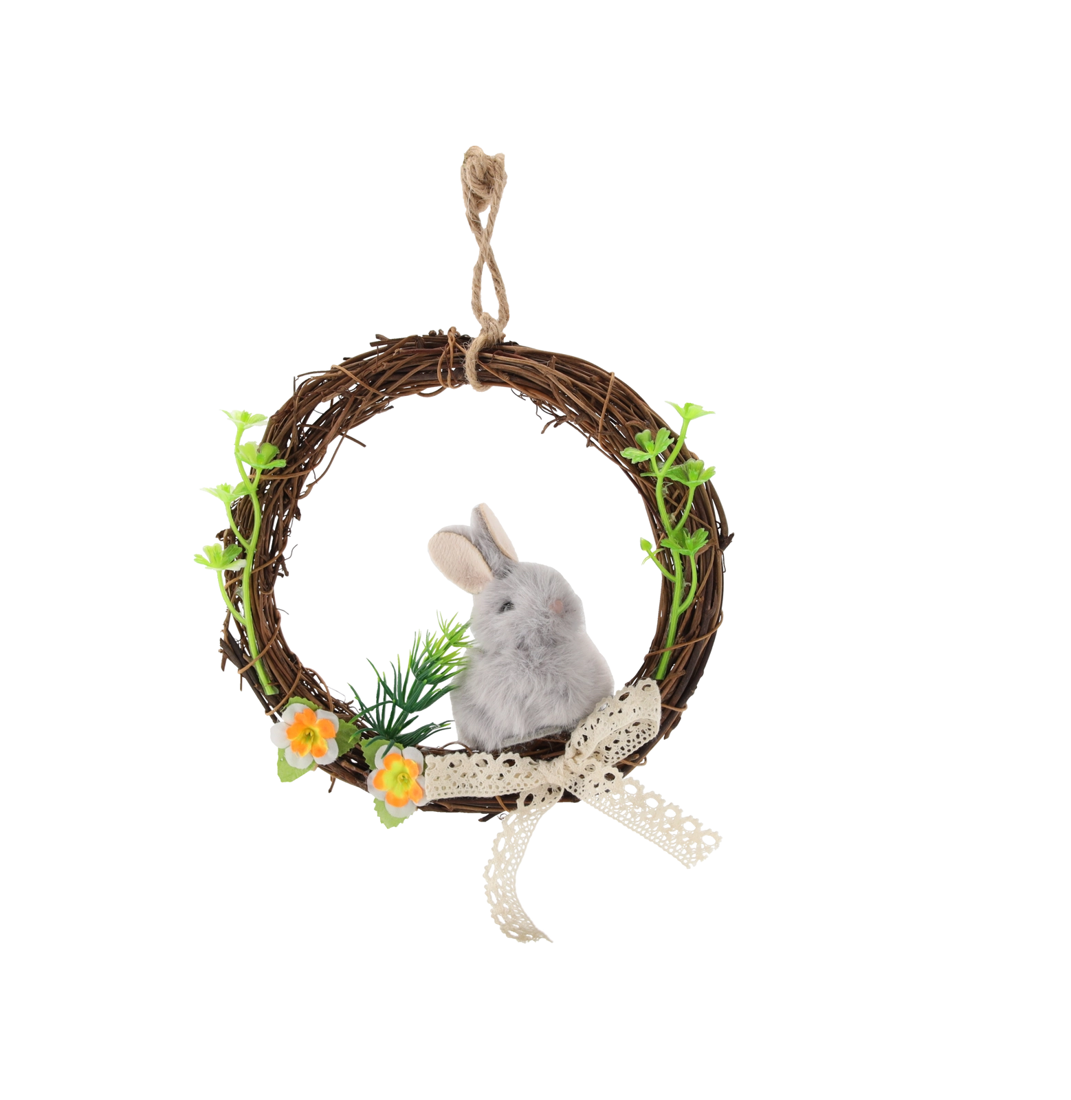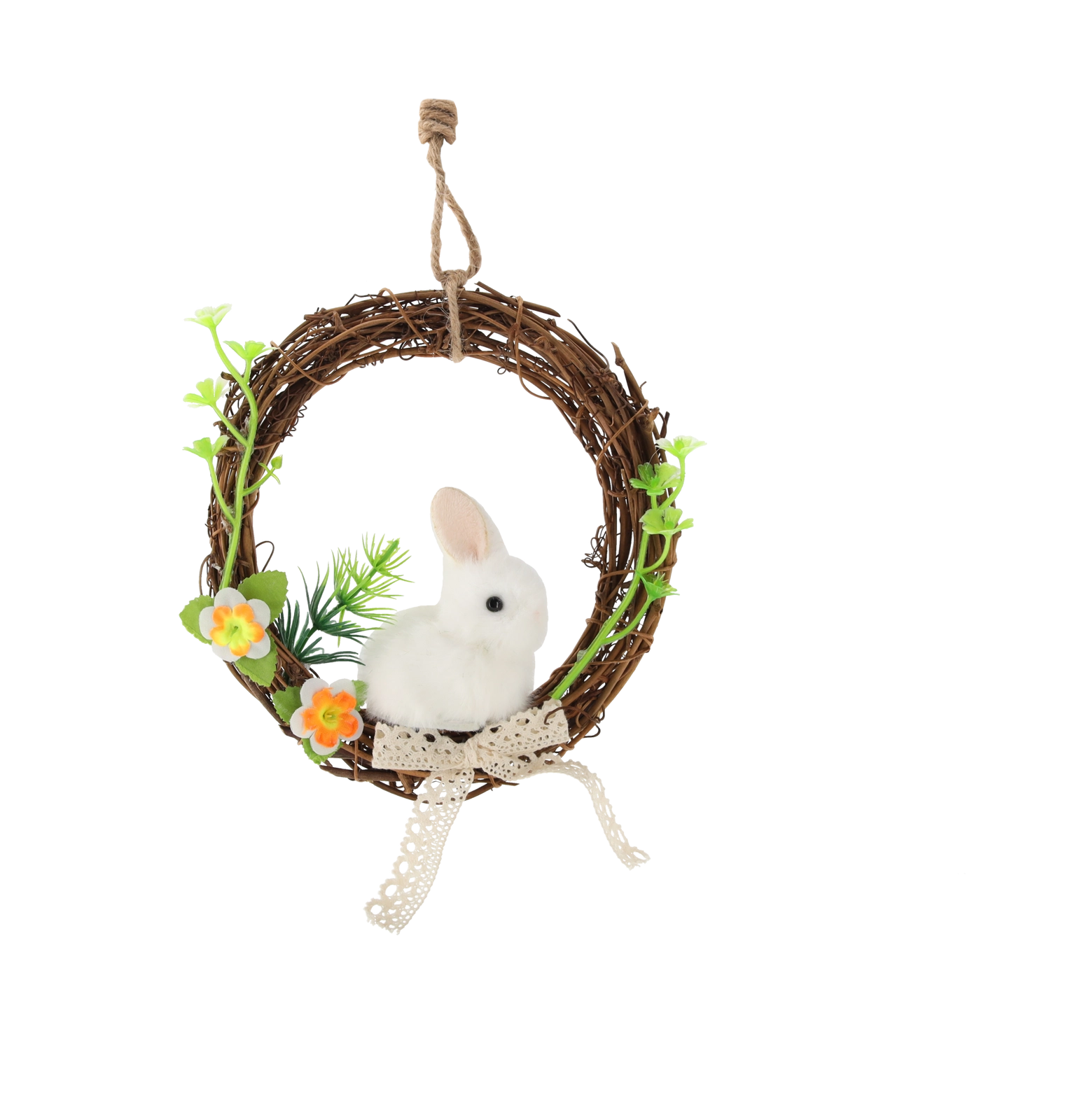 Mehki plišasti zajček vencu doda igrivost in ga spremeni v popoln velikonočni poudarek za predsobo ali dnevno sobo.