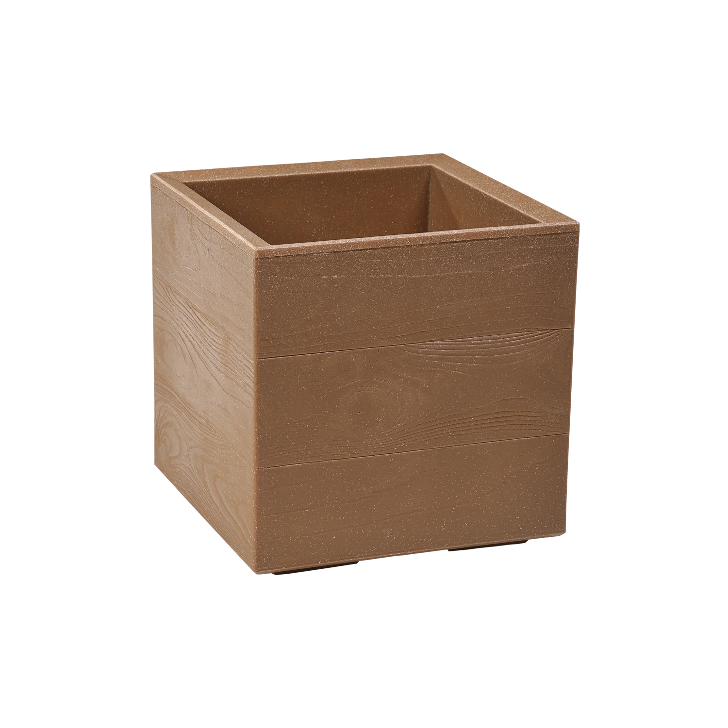 Moderen kvadratni cvetlični lonec z dizajnom, ki posnema les, združuje stajliš videz in minimalno vzdrževanje. Izdelan je iz reciklirane plastike z lesnim dodatkom, je odporen proti zmrzali in vremenskim vplivom, ima kolesca za enostavno premikanje ter odtočno odprtino z zaporko za priročno uravnavanje vode. Primeren za notranjo in zunanjo uporabo.