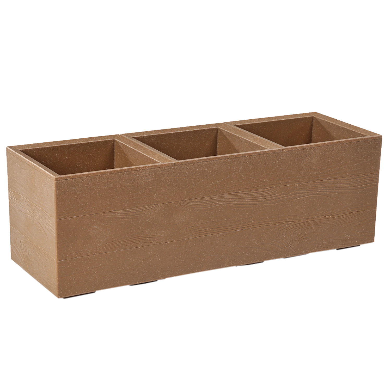 Vzdržljiva plastika z dodatkom recikliranega lesa (do 40 %) zagotavlja barvno obstojnost in odpornost proti zmrzali ter UV-sevanju. Prostorna prostornina 39 litrov in podolgovata oblika nudita dovolj prostora za okrasne trave, zelišča in cvetoče rastline.