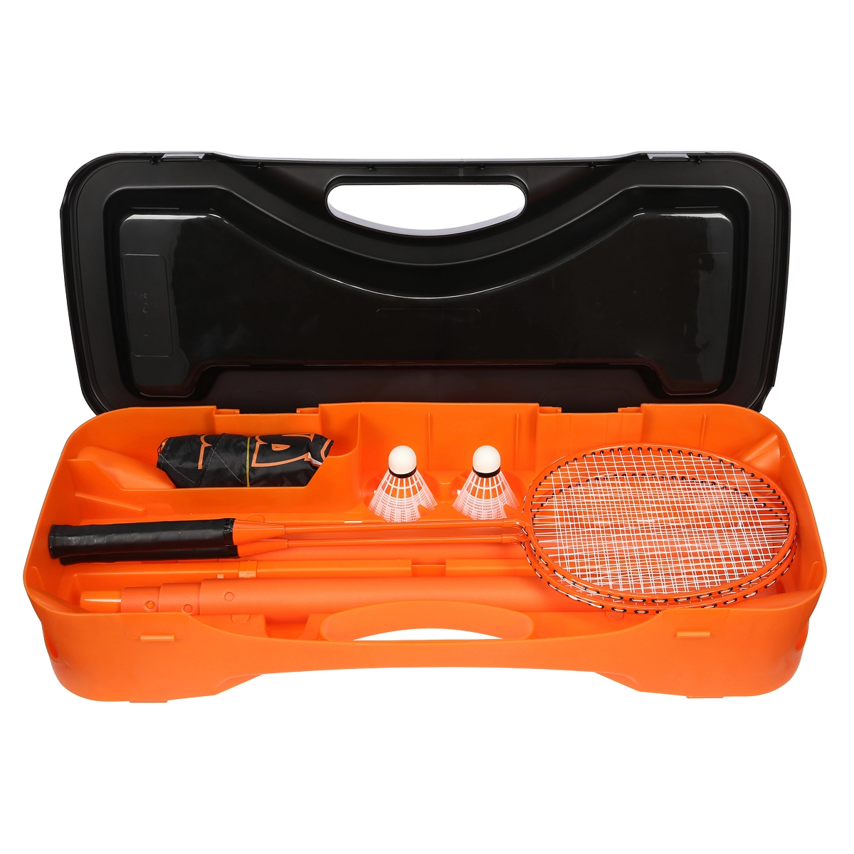Set vsebuje vse potrebno za takojšnjo igro: dva loparja, dve peresi, zložljivo mrežo in trden transportni kovček z organiziranimi predelki. Kompaktno pakiranje (68 × 28,5 × 12 cm) se zlahka prilega v avto ali domači shranjevalni prostor, zato lahko igrate badminton na vrtu, v parku ali na počitnicah.