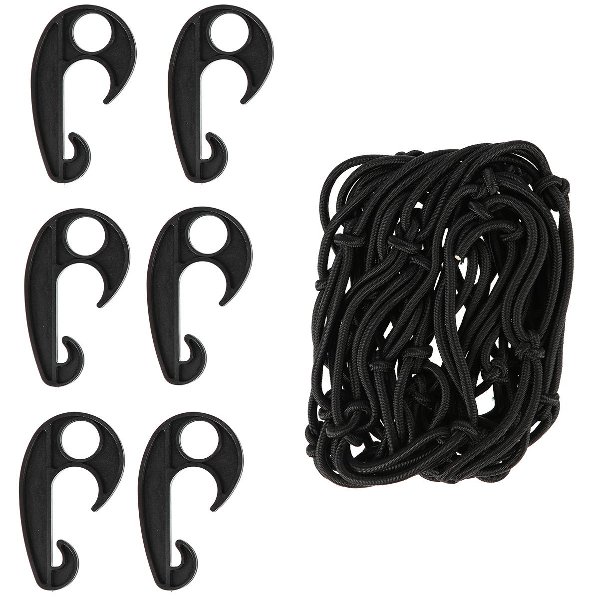 Del paketa je 6 plastičnih kavljev, ki omogočajo hitro pritrditev na obroče vozička, prtljažnik avtomobila ali druge sidrne točke. Mreža je lahka, enostavna za shranjevanje in vedno pripravljena pomagati pri kampiranju, na poti ali doma.