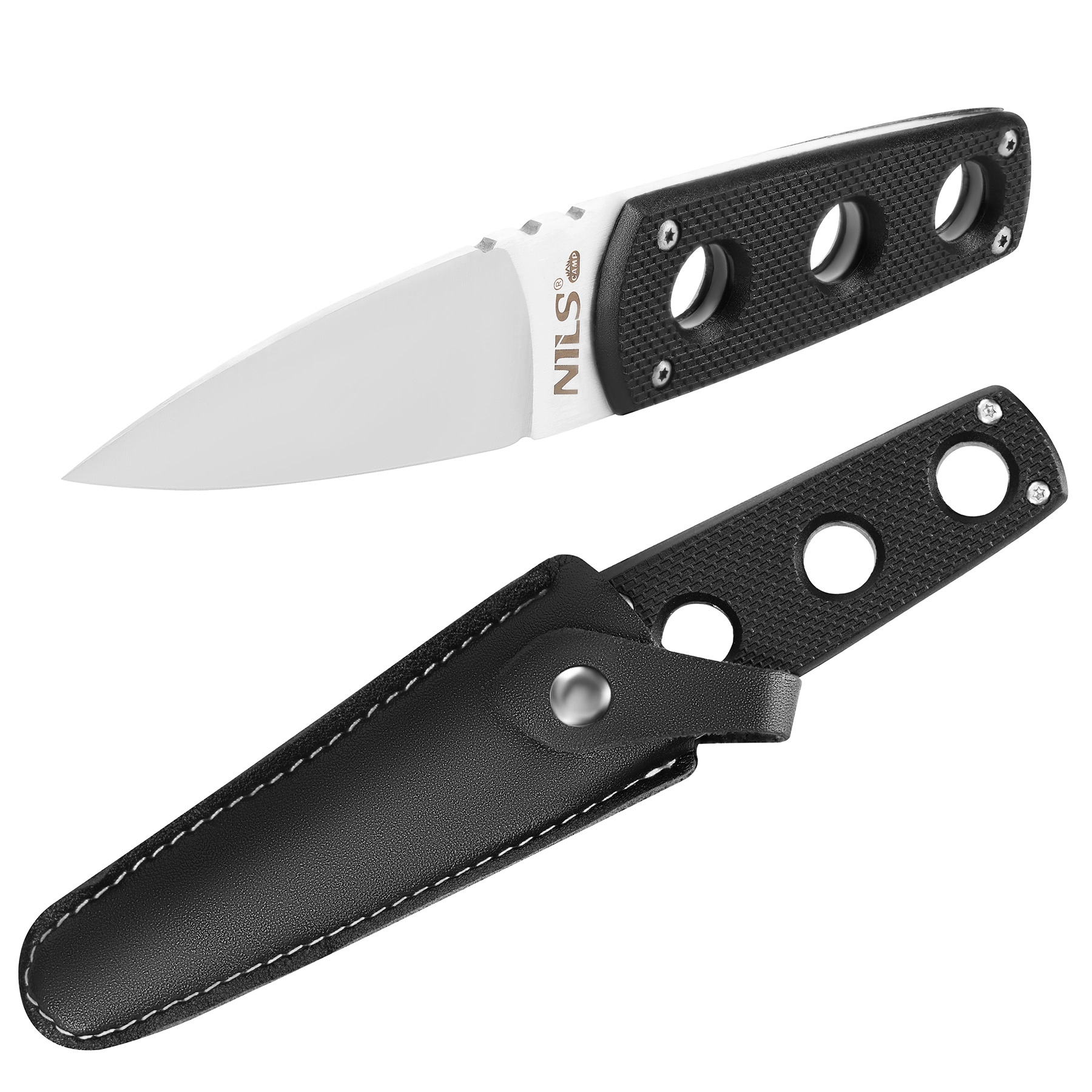 Ergonomski ročaj z nedrsečo teksturo zagotavlja zanesljiv oprijem tudi v mokrih razmerah ali z rokavicami. Zaščitni tok z možnostjo pripenjanja na pas ali nahrbtnik ohranja nož varno pri roki med gibanjem po terenu.