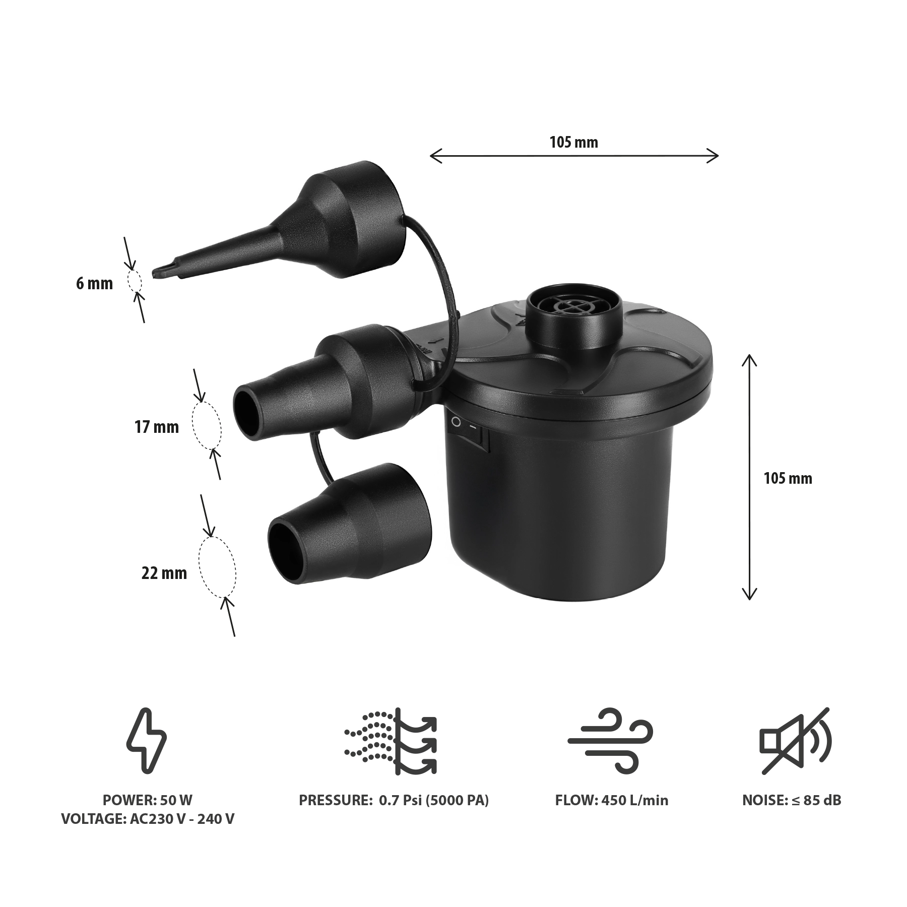 V paketu najdete omrežni adapter 230 V in 12 V adapter za avtomobilski vžigalnik, zato boste črpalko uporabljali doma in na poti. Trije zamenljivi nastavki (6/17/22 mm) zagotavljajo združljivost z večino ventilov. Trpežni materiali in nizka masa omogočajo enostavno prenašanje in shranjevanje.