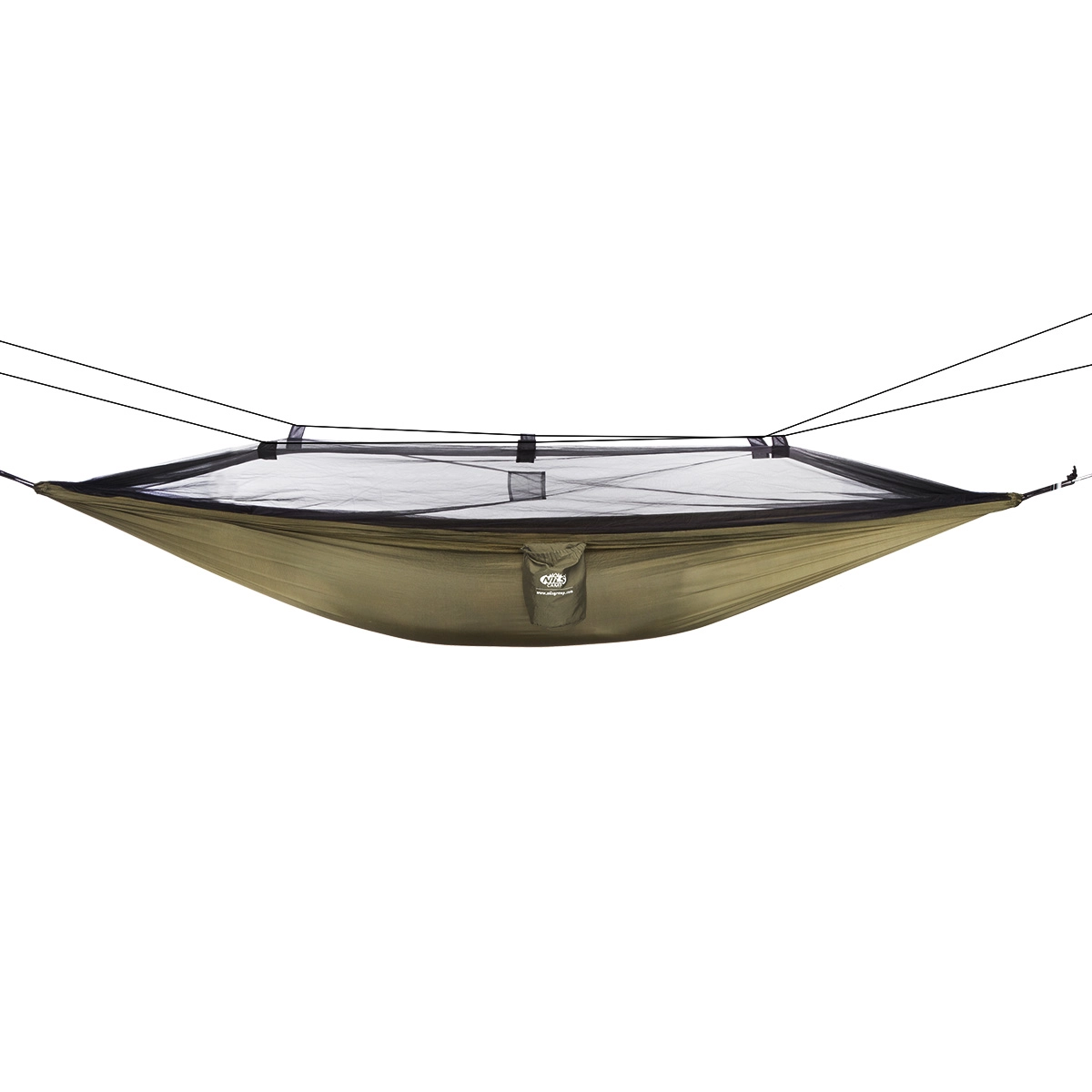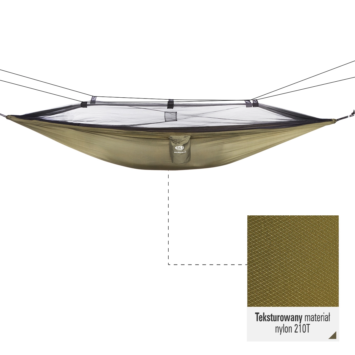 Vzdržljiv 210T najlon (70 g/m²) je lahek, zračen, odporen na vlago in se hitro suši. Po zložitvi se spravi v integriran etui velikosti 24 × 13 cm in tehta le 0,69 kg, zato je idealen za nahrbtnik. Nosilnost 180 kg ter čvrsti končni preboji s karabinami zagotavljajo zanesljivo obešanje.
