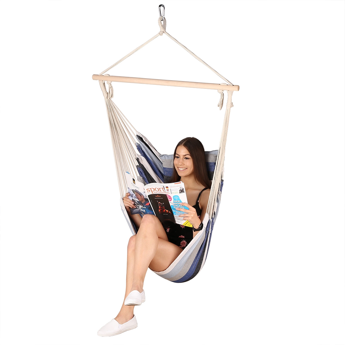 Brazilski stol združuje udobje viseče mreže s stabilnostjo sedišča. Tekstilni del iz trpežnega mešanega platna (60 % poliester, 40 % bombaž) je oblikovan s pomočjo močnih vrvi, ki so speljane skozi leseno razpiralno prečko in se zbirajo v varno obešalno ušesce. Dovolj je, da ga obesite na ustrezno višino in uživate v branju, počitku ali nežnem pozibavanju.