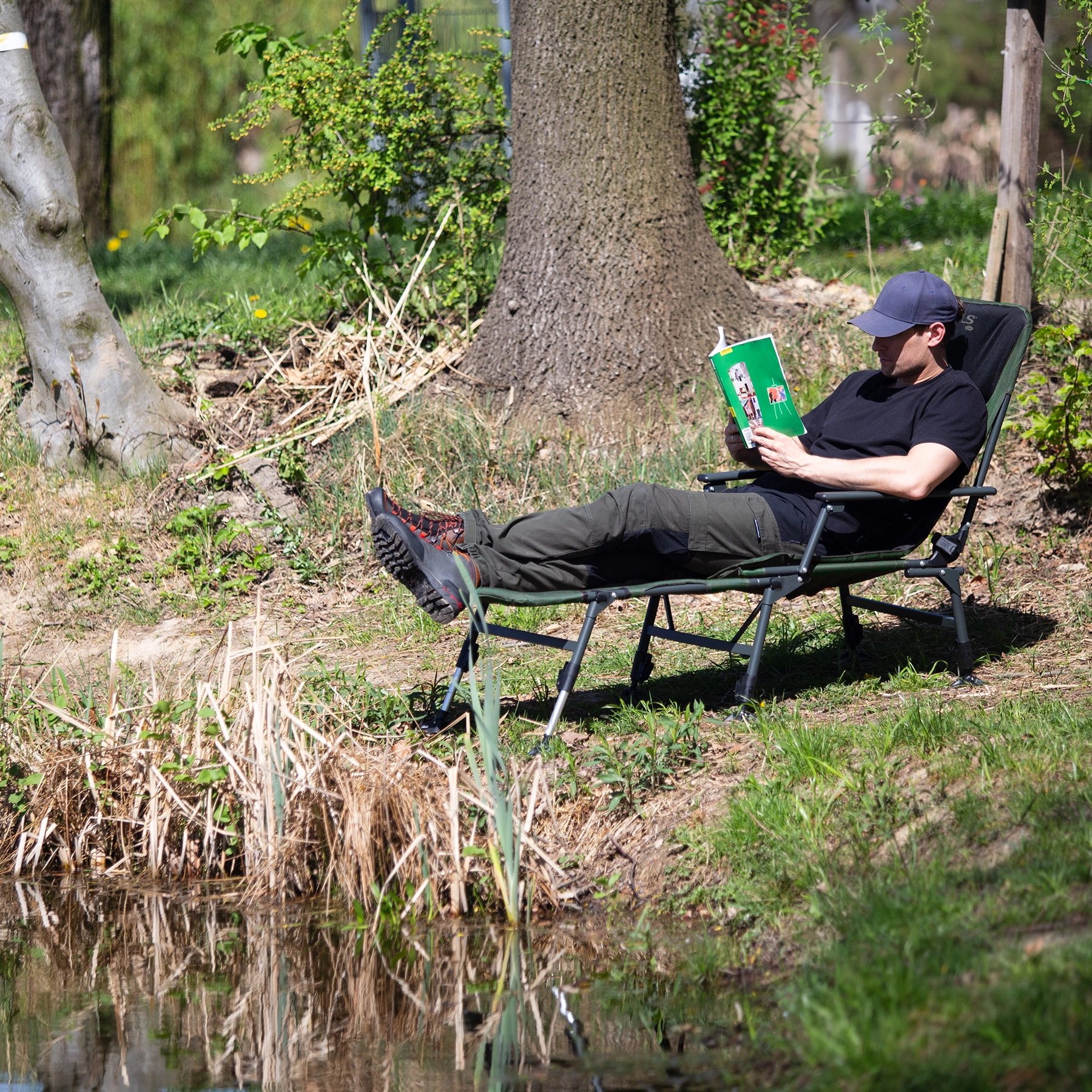 Tekoče nastavljanje naslonjala in snemljiv podnožnik spremenita stol v udobno ležalnik – idealno za daljše čakanje ob vodi in počitek po turi.