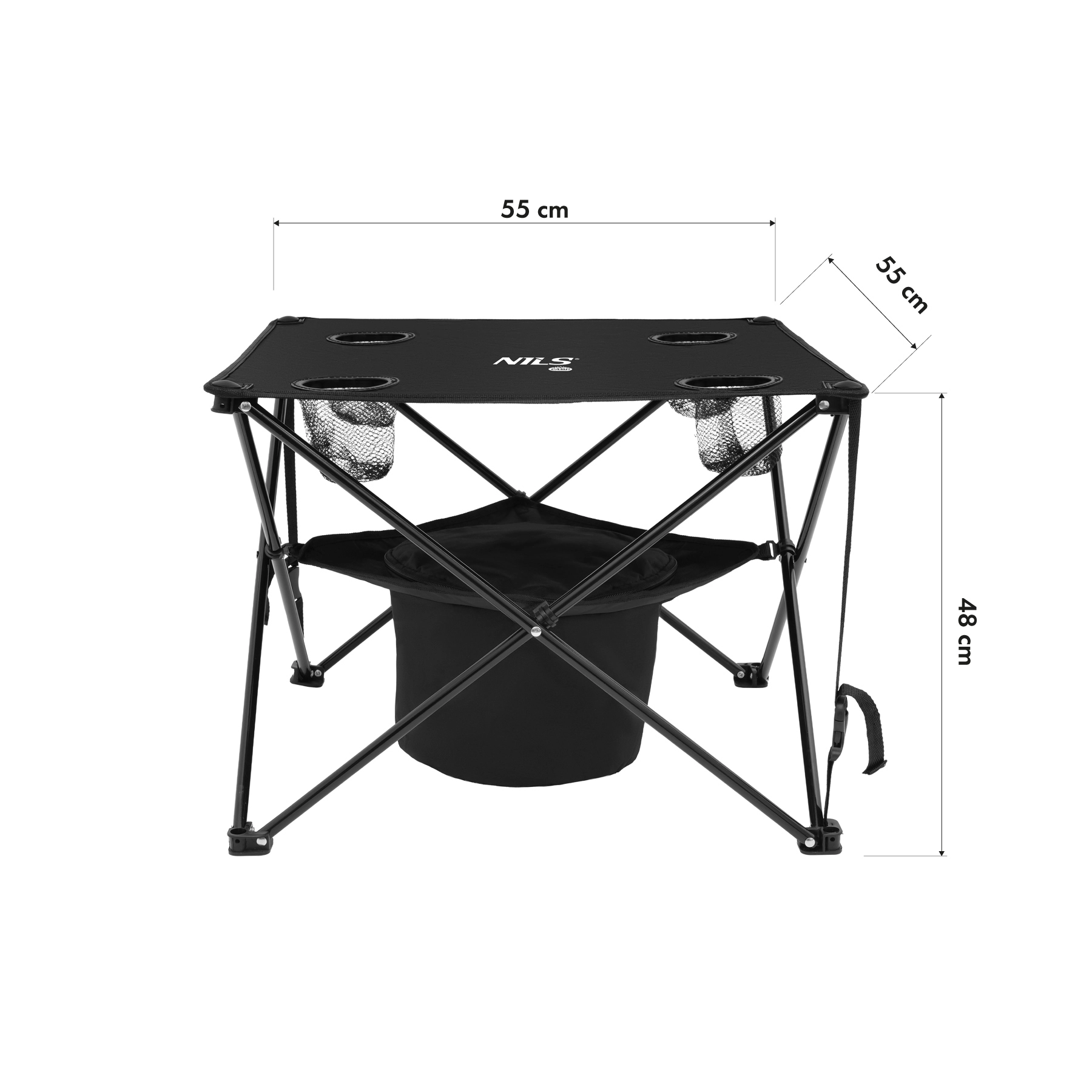 Praktičen kamping komplet NILS Camp ponuja zložljivo mizo in dva udobna stola za sprostitev na izletih, piknikih in ob vodi. Pod namizjem je integrirana hladilna torba za pijačo in prigrizke, na plošči mize pa so štirje držali za kozarce ali steklenice. Zahvaljujoč trdni jekleni konstrukciji, vzdržljivim materialom in kompaktnim meram po zložitvi je komplet stabilen, enostavno prenosljiv in idealen za kampiranje.