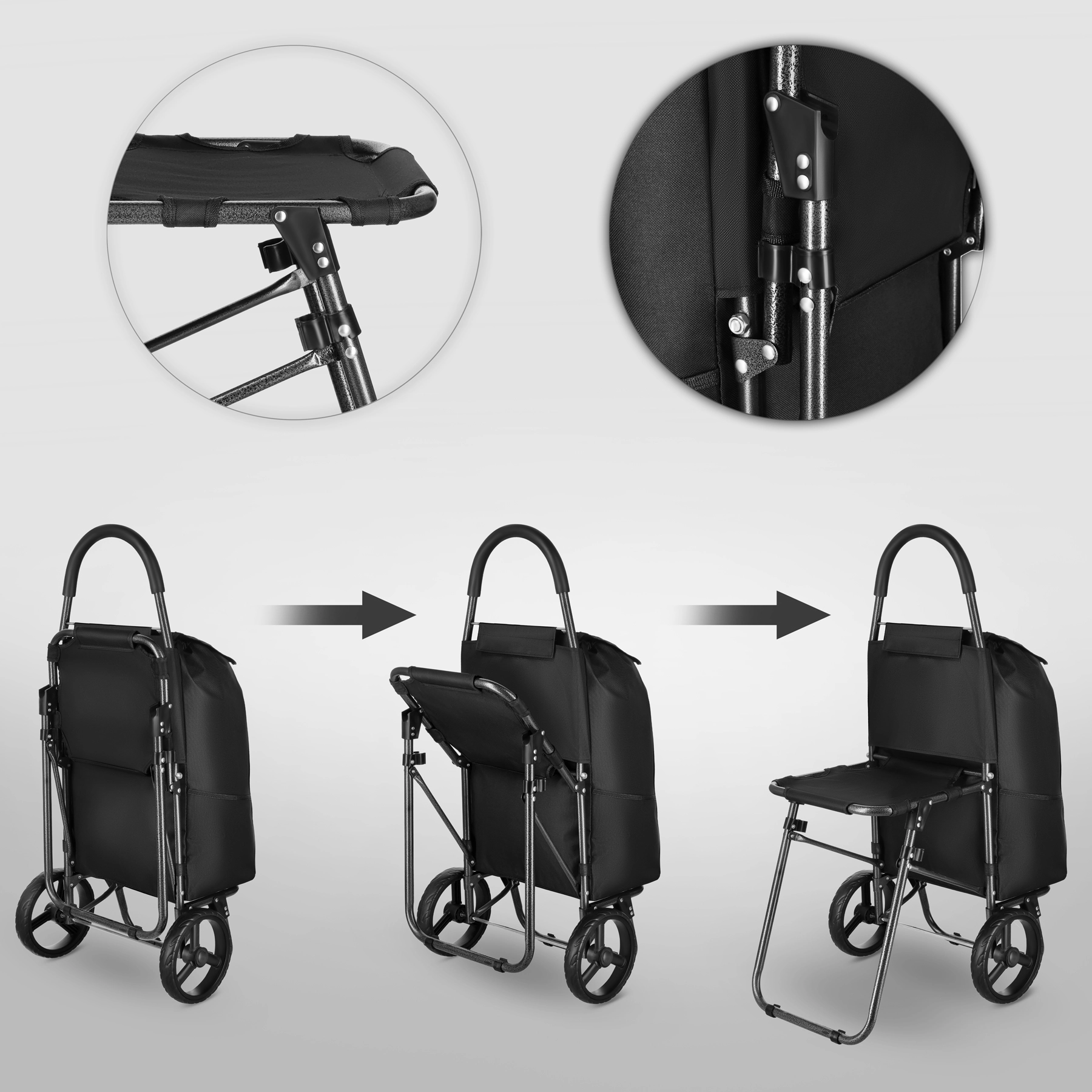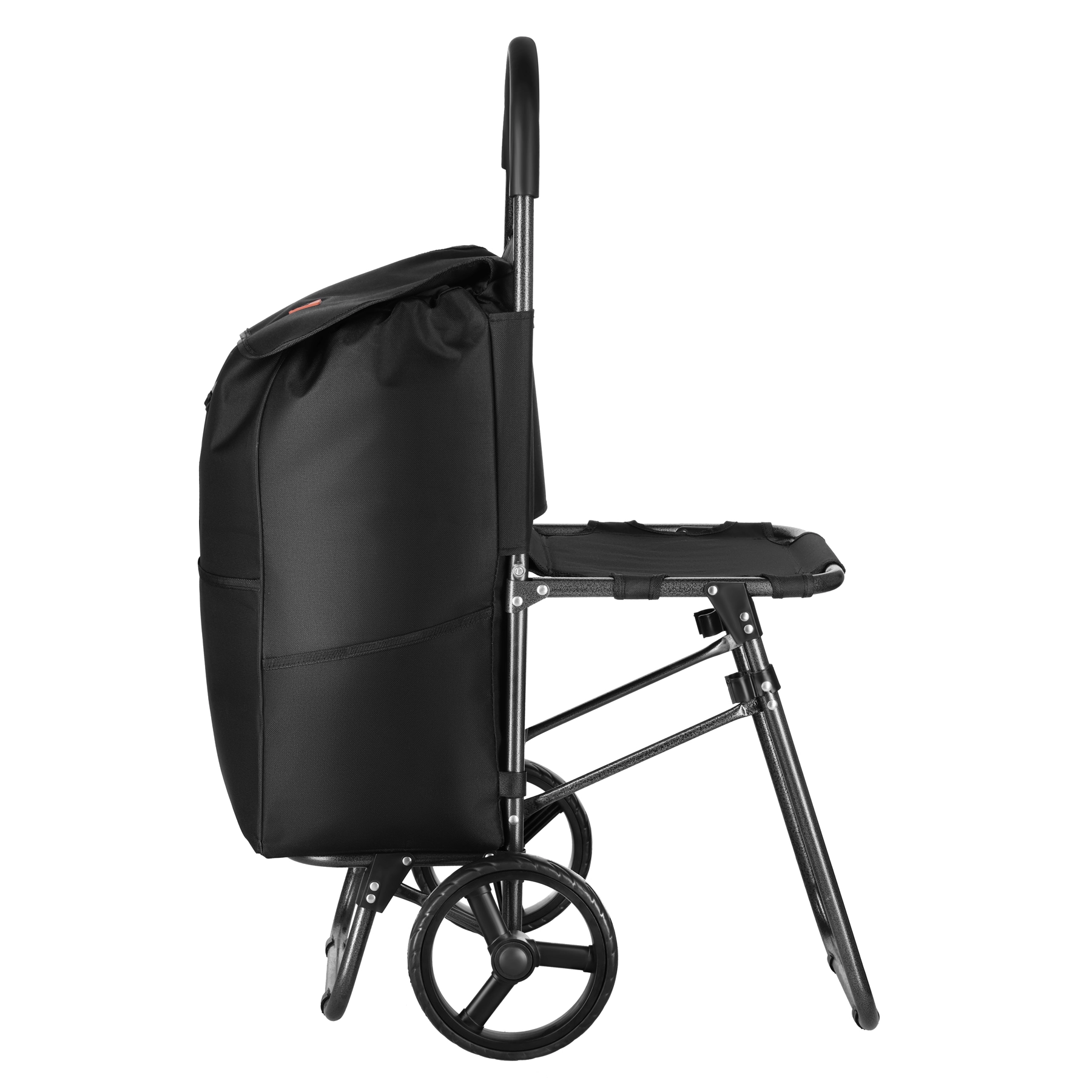 Edinstvena prednost je zložljiv sedež, ki omogoča počitek kadar koli – med čakanjem v vrsti ali na sprehodu. Glavni predal ima zatezno vrvico in preklop z zaponko za varno shranjevanje nakupa, medtem ko 3 zunanji žepi sprejmejo drobnarije, ki jih želite imeti pri roki. Torbo je zaradi ježkov enostavno snemati, ojačano dno pa izboljša stabilnost pri pakiranju.