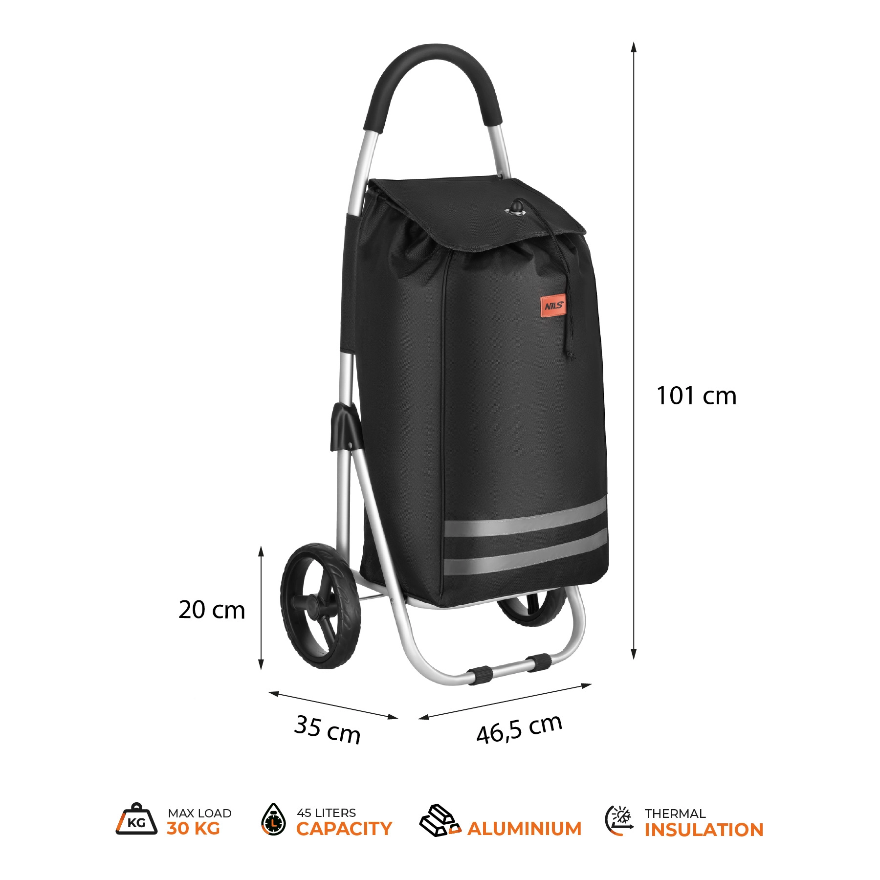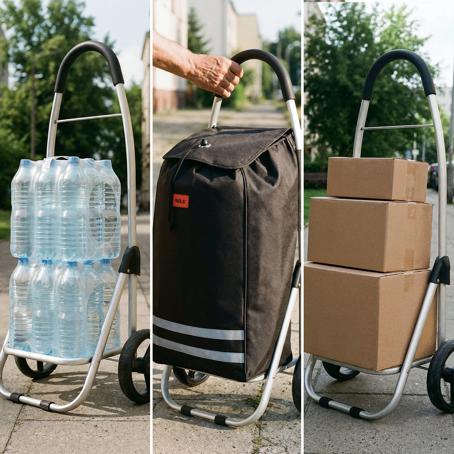 Nakupovalni voziček NILS je premišljen pomočnik za vsakodnevne nakupe. Trpežna torba iz poliestra 900D z notranjim termoizolacijskim slojem ohranja živila dlje časa sveža, medtem ko aluminijast okvir skrbi za stabilnost ob nizki teži. Glavni predel z zatezno vrvico in preklopom zanesljivo ščiti vsebino pred izpadanjem in dežjem.