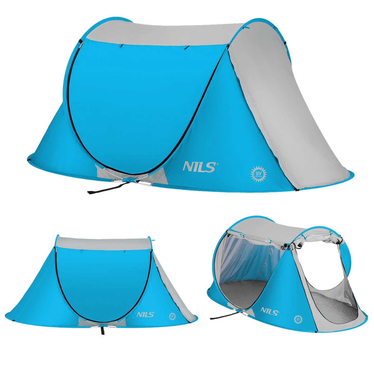 Material z UV-zaščito zmanjšuje vpliv sončnega sevanja in nudi prijetno senco. Zapirljivi vhodi ščitijo pred vetrom in peskom.