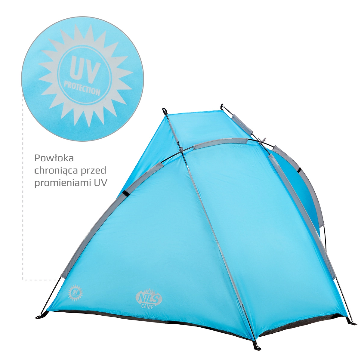 Uživajte v poletnih dneh v udobju in senci s plažnim šotorom NILS Camp. Prostorna talna površina 105 × 210 cm in višina 110 cm ustvarjata prijetno zavetje pred ostrim soncem in neprijetnim vetrom. Konstrukcija iz steklenolaminatnih palic se postavi hitro in enostavno, šotor pa prenese tudi manjšo dežno ploho.