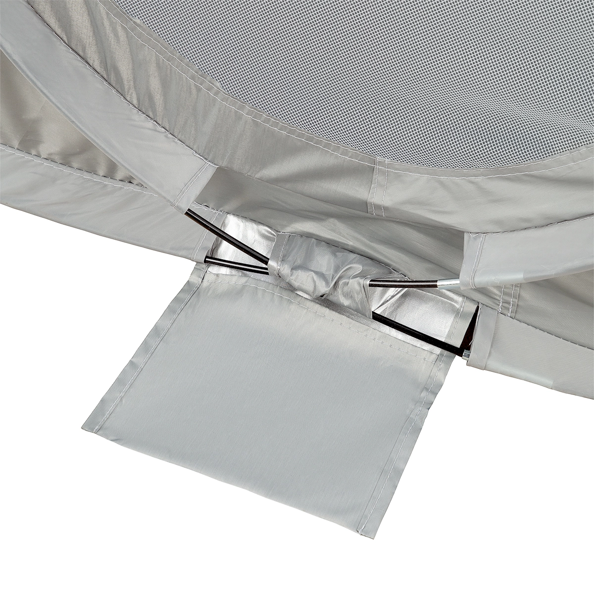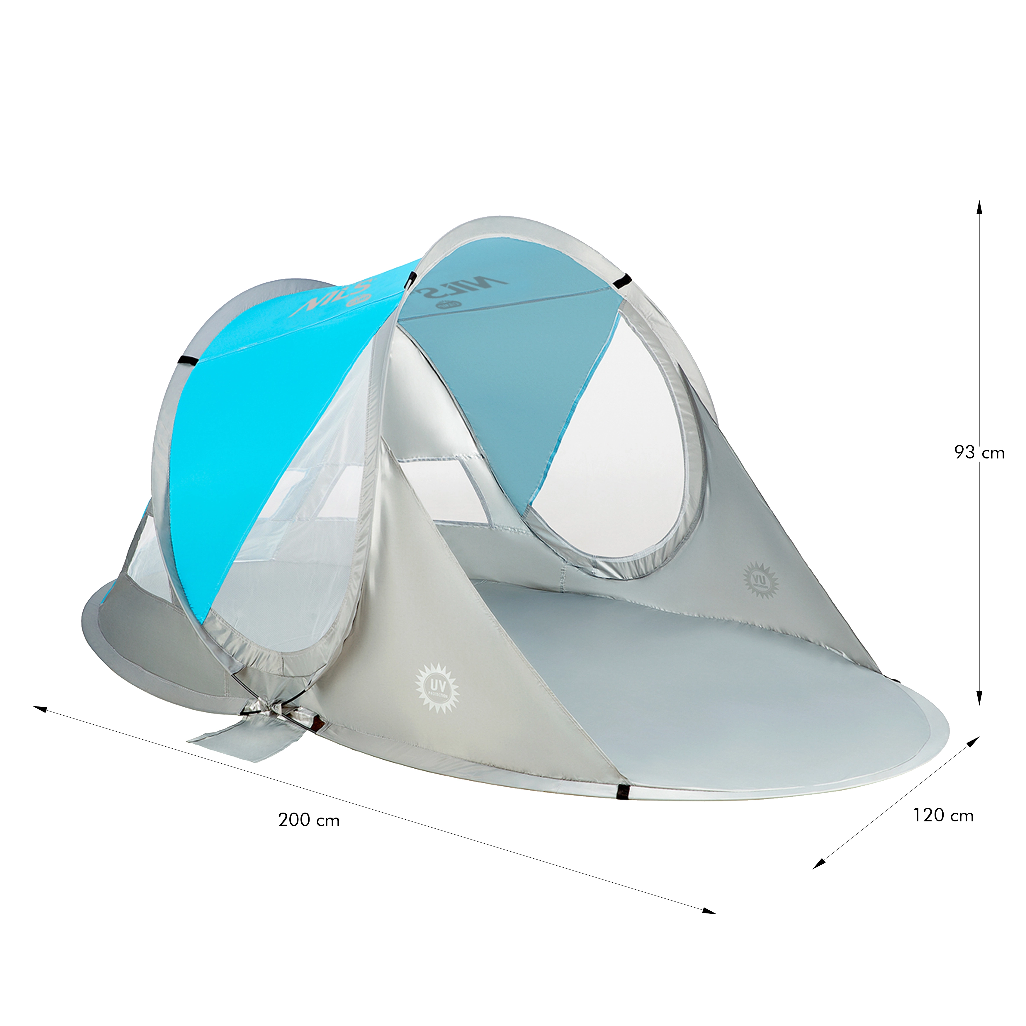Zaradi UV odbojnosti 96 % šotor nudi učinkovito zaščito pred škodljivim sončnim sevanjem. Tla z merami 200 × 120 cm in višina 93 cm ponujajo dovolj prostora za sedenje in igro otrok. Po uporabi šotor preprosto zložite z enim gibom nazaj v kompaktno embalažo s premerom 60 cm – idealno za udobno prenašanje in shranjevanje.