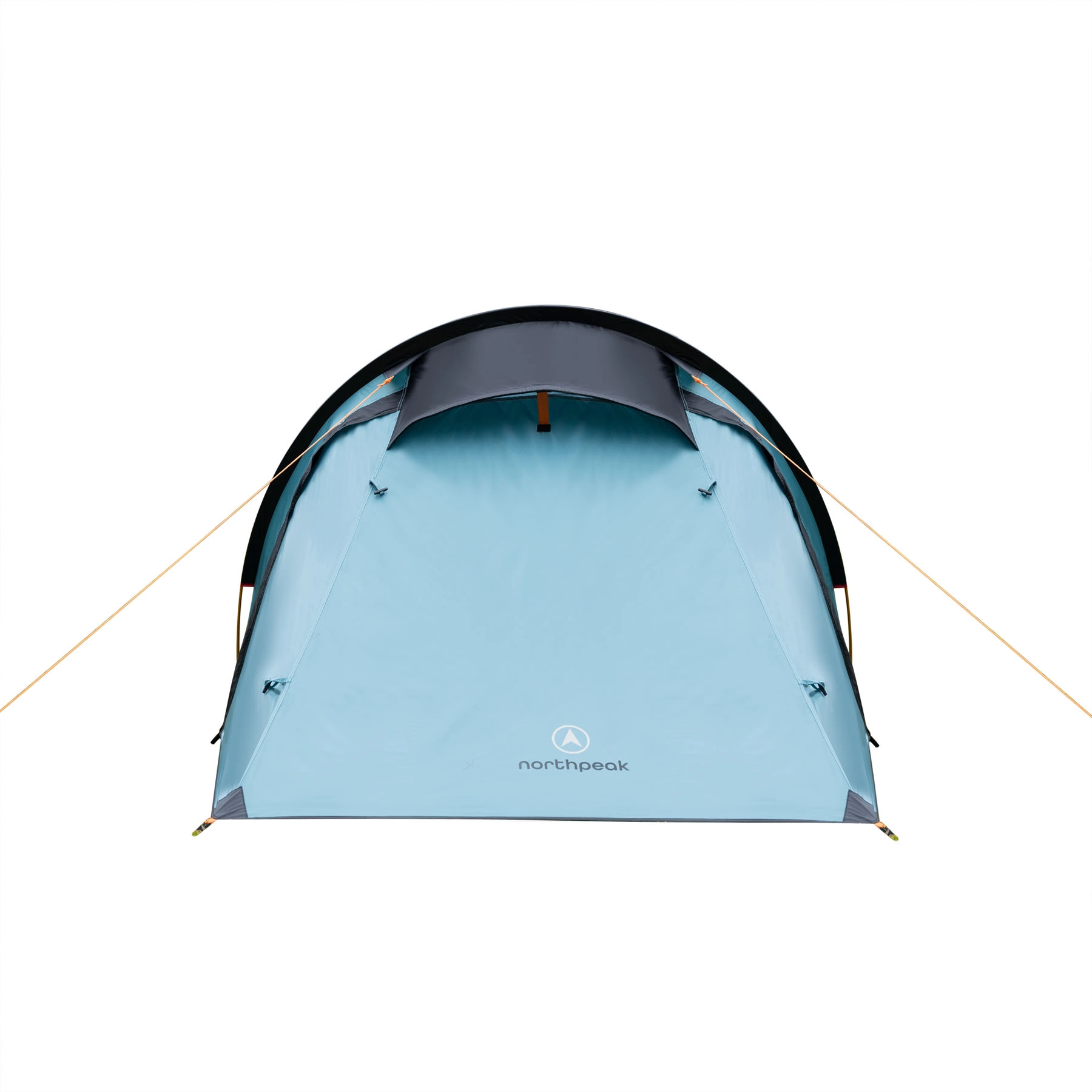 Stabilna tunelska konstrukcija z aluminijastimi palicami (Ø 8 mm) in lahkimi aluminijastimi klini ohranja obliko tudi v slabšem vremenu. Prezračevalne odprtine z mrežico podpirajo kroženje zraka in preprečujejo kondenzacijo, medtem ko lepljeni šivi in višji vodni stolpec ohranjajo notranjost suho.
