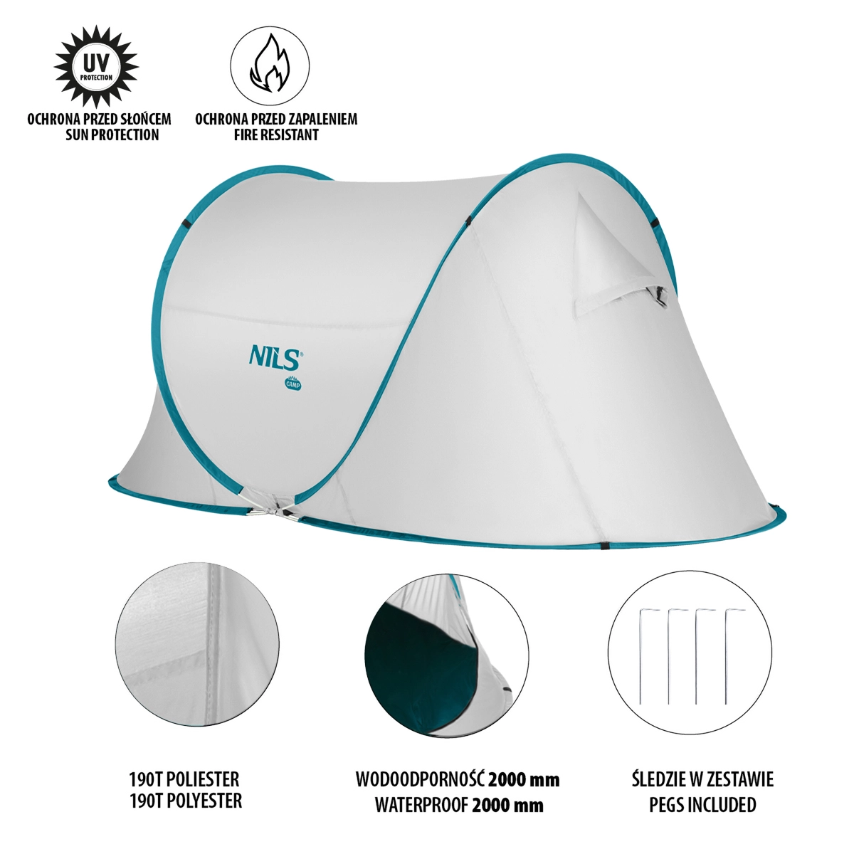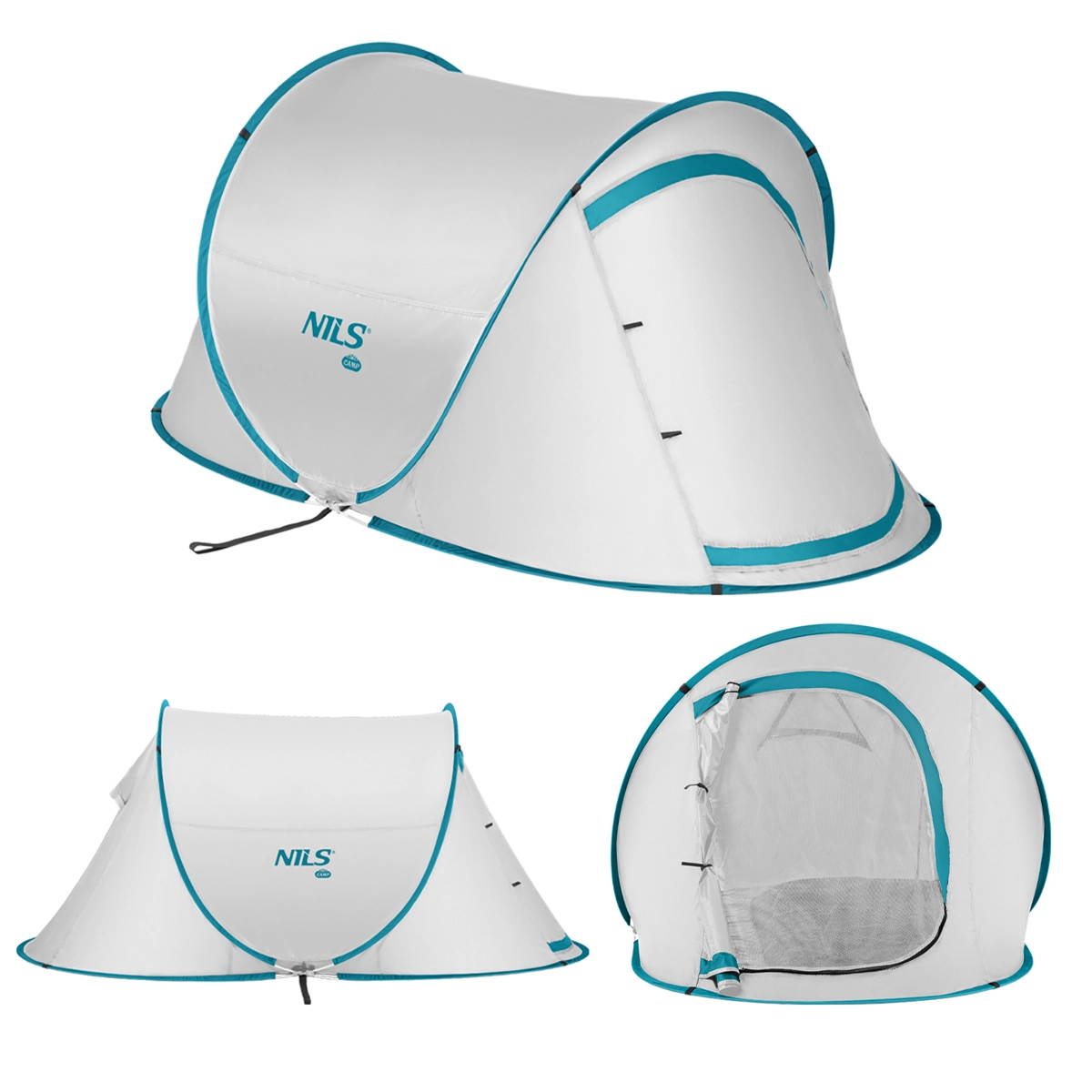 Šotor NILS Camp je zasnovan za hitro in udobno sprostitev ob morju, jezeru ali na vrtu. Zahvaljujoč pop-up sistemu se razpre iz transportne torbe v nekaj sekundah, brez orodja in zapletene manipulacije. Mreža proti komarjem in sprednja ponjava z zadrgo ščitita pred žuželkami in vetrom, medtem ko prezračevalna odprtina zagotavlja svež zrak in prijetno klimo v notranjosti.