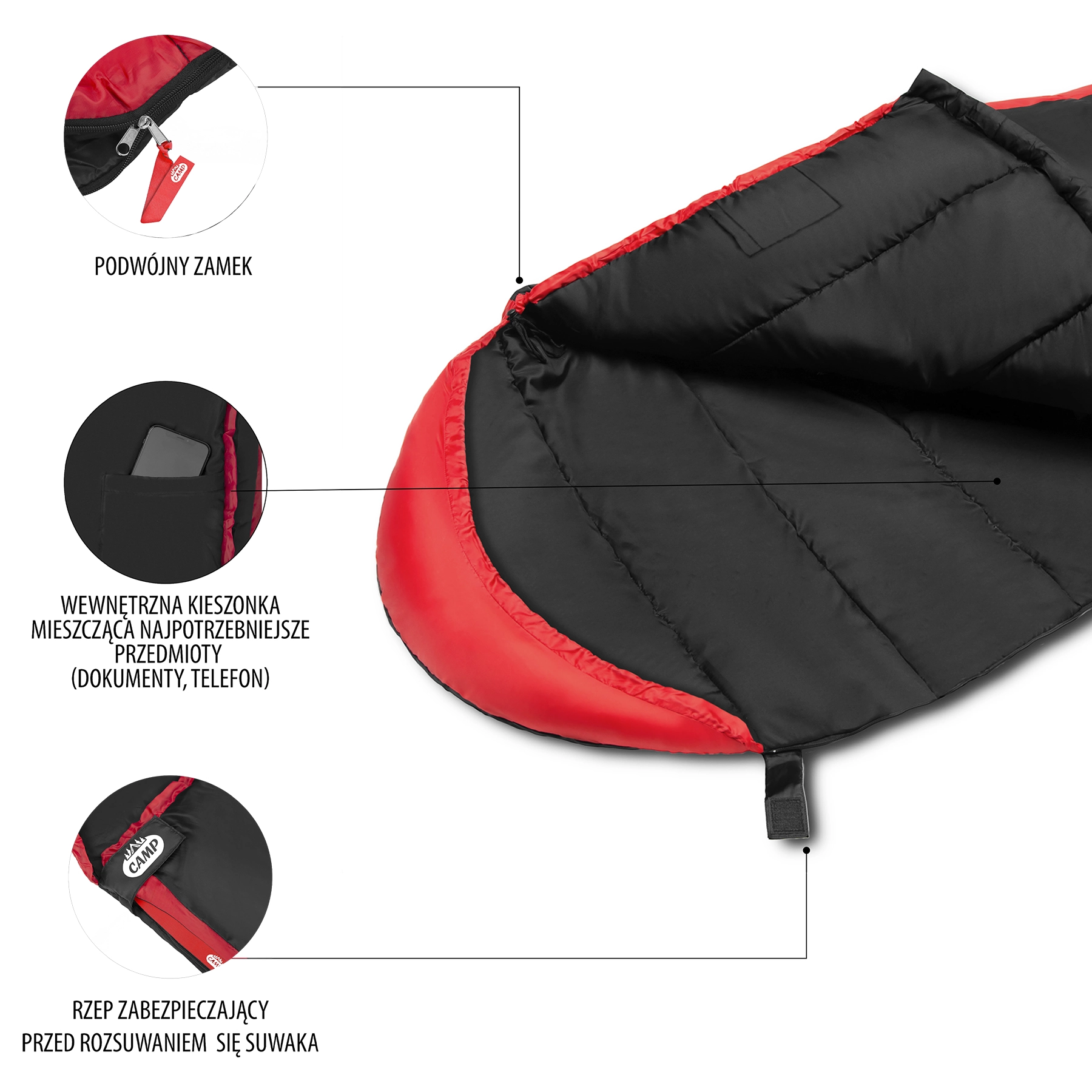 Obojestranska zadrga je prekrita z izolacijsko letvico in zavarovana s široko manšeto z ježkom, zato se ponoči ne odpre sama od sebe. Nastavljiva kapuca z zatezno vrvico in zatičem dodatno zmanjšuje uhajanje toplote. Priložena je praktična kompresijska vreča, ki po zategovanju zmanjša prostornino približno za tretjino.