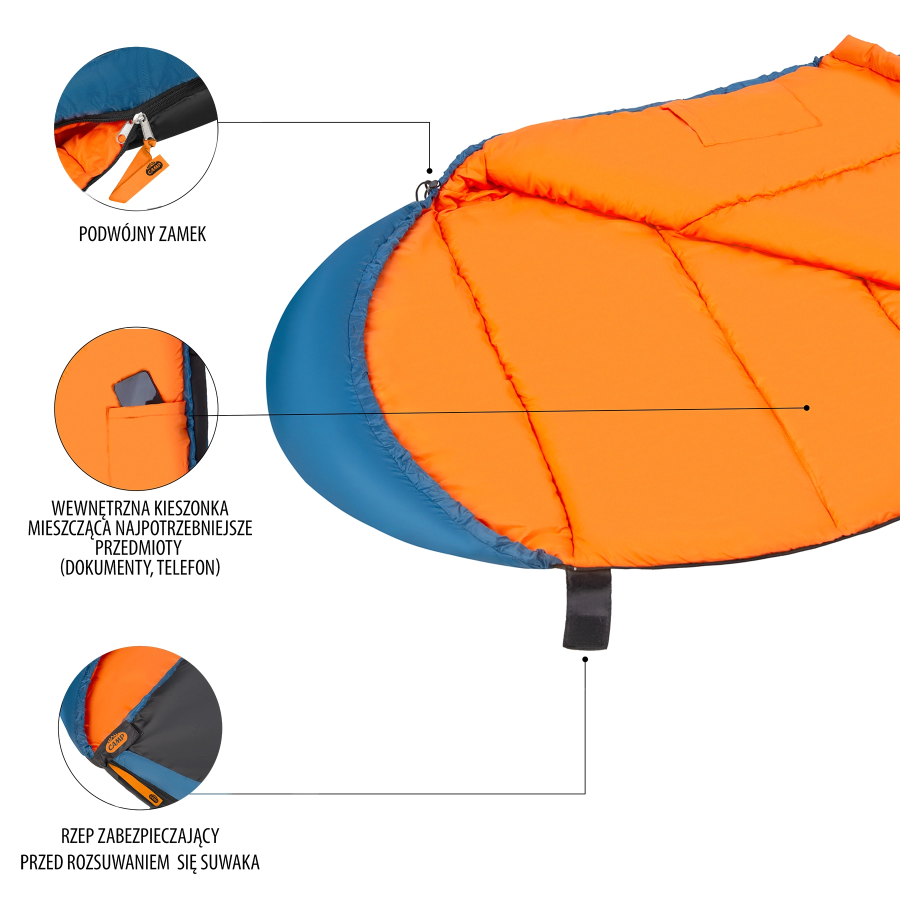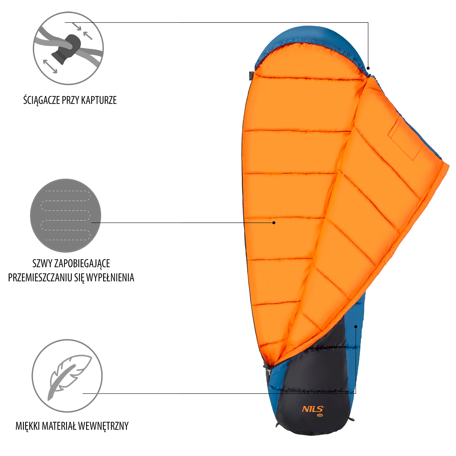 Polnilo iz votlih vlaken 300 g/m² nudi uravnoteženo izolacijo, prešivanje preprečuje premikanje polnila in zagotavlja enakomerno segrevanje. Obojna zadrga je prekrita z izolacijskim prekrivom in dodatno zavarovana s široko manšeto na ježka, zato se med spanjem ne odpira. Kapuca z zatezno vrvico in stoperjem pomaga zadržati toploto pri glavi. Ko jo pospravite v kompresijsko vrečo, prihranite približno tretjino prostornine.