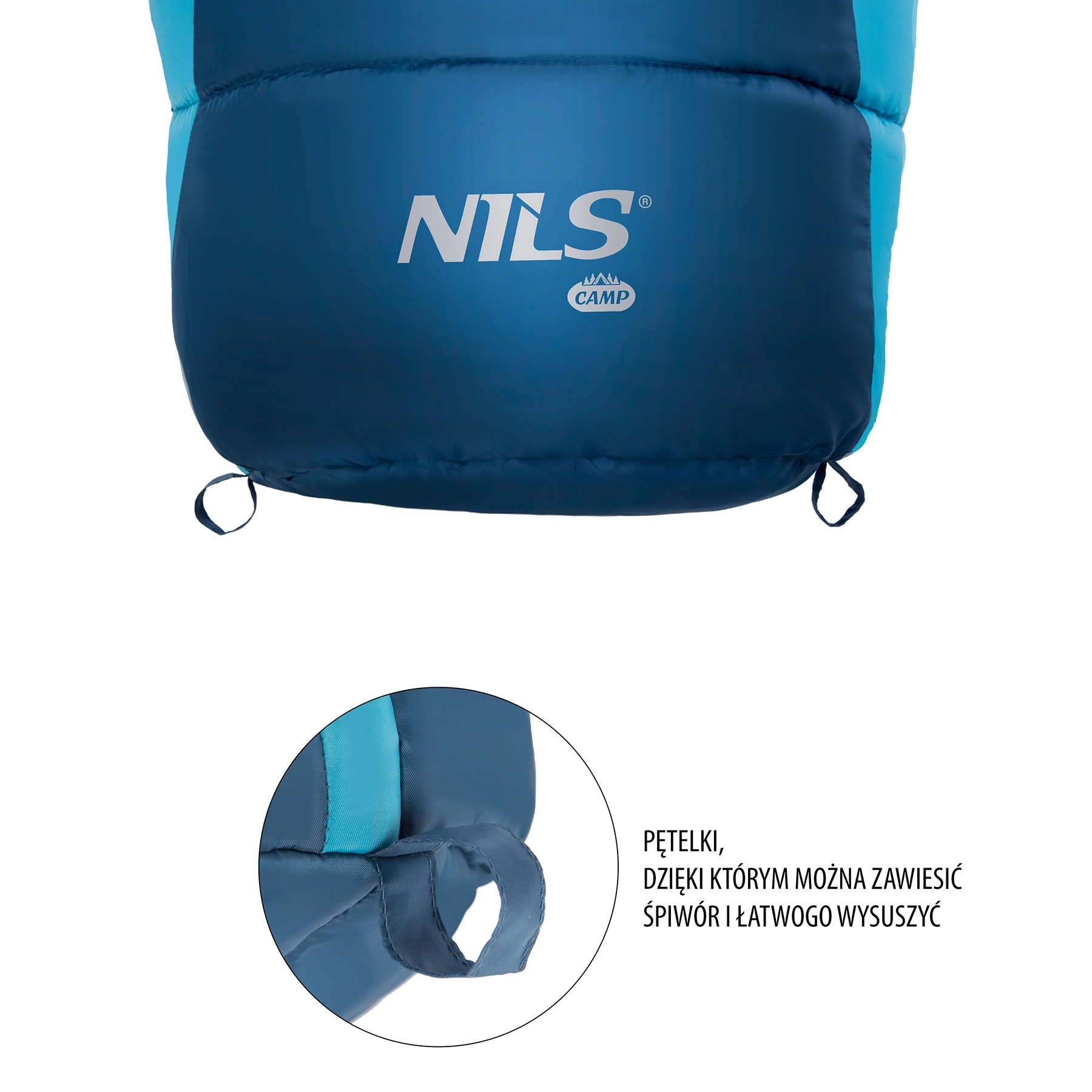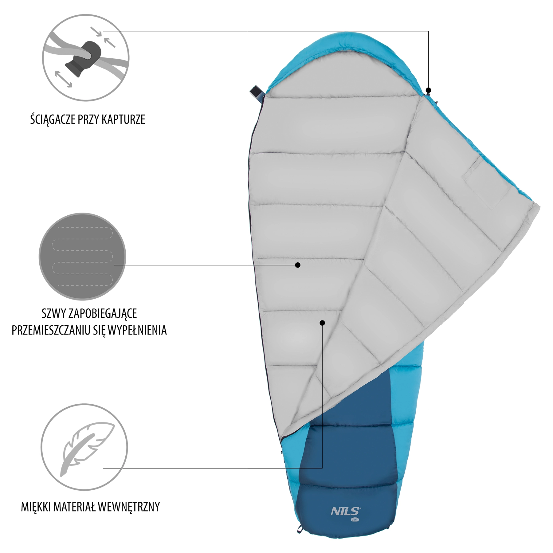 Mumijska spalna vreča NILS Camp je zasnovana za udoben spanec v hladnejših razmerah. Ožji kroj sledi obliki telesa in skupaj z zatezno kapuco zadržuje toploto v notranjosti. Notranji material 190T Pongee je prijeten na dotik, medtem ko zunanji 190T poliester W/R Cire ščiti pred mrazom in vlago. Polnilo iz votlih vlaken 300 g/m² nudi enakomerno in stabilno izolacijo, ki jo podpira skrbno prešitje.