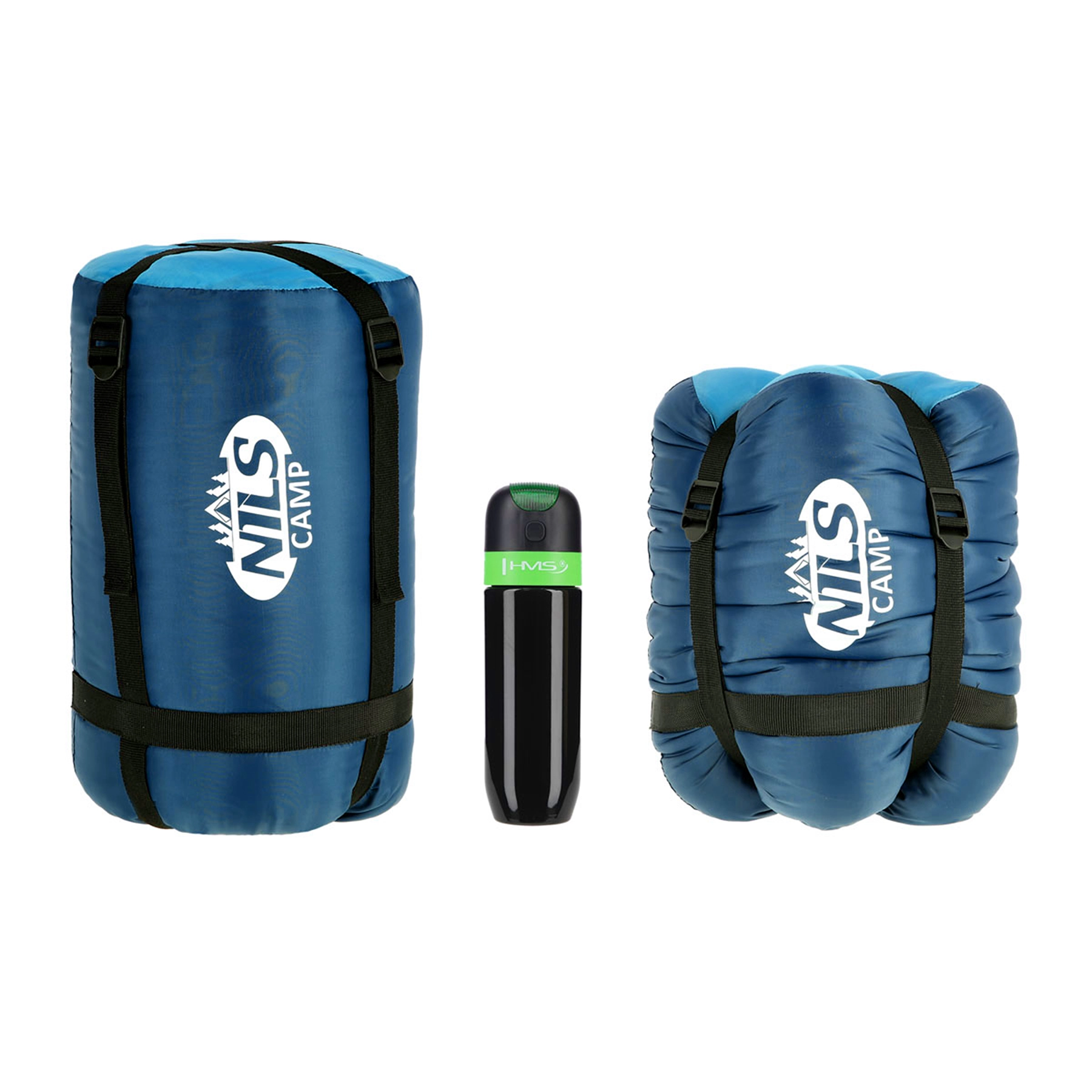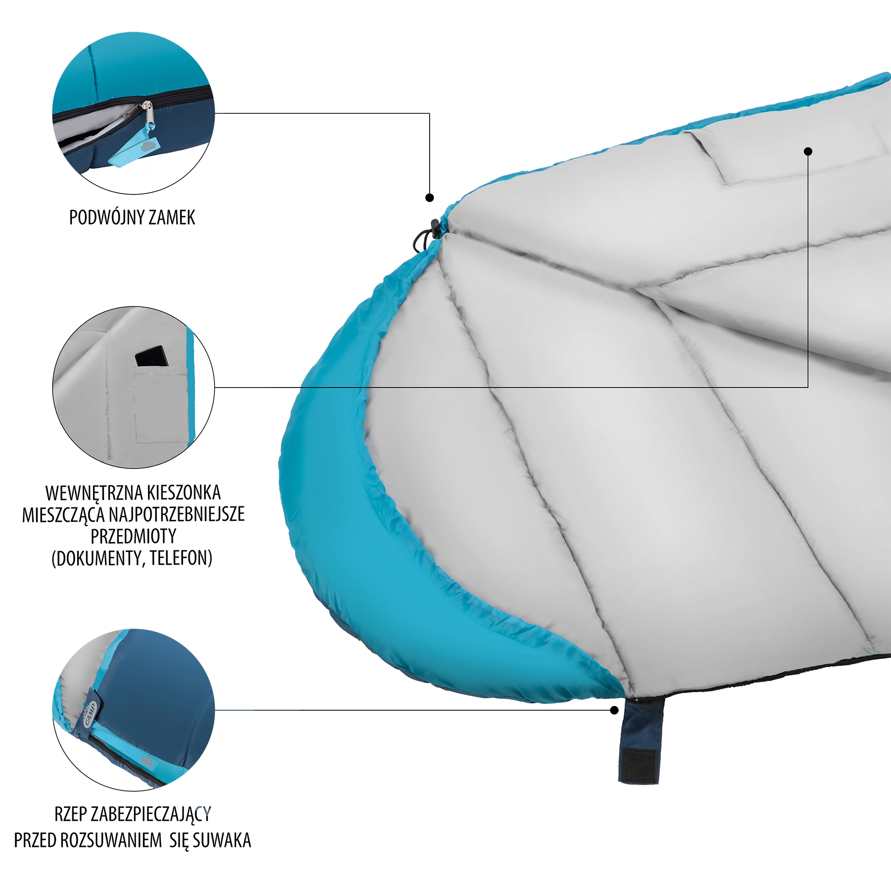 Praktične podrobnosti vključujejo dvosmerno zadrgo, zavarovano s širokim patentom z ježkom, zato se ne odpira samodejno niti pri obračanju. Zadrga je prekrita z izolacijsko letvico za zmanjšanje toplotnih izgub. Priložena je kompresijska vreča s trakovi, ki po zategovanju zmanjša volumen približno za tretjino – popolno za nahrbtnik ali kovček.