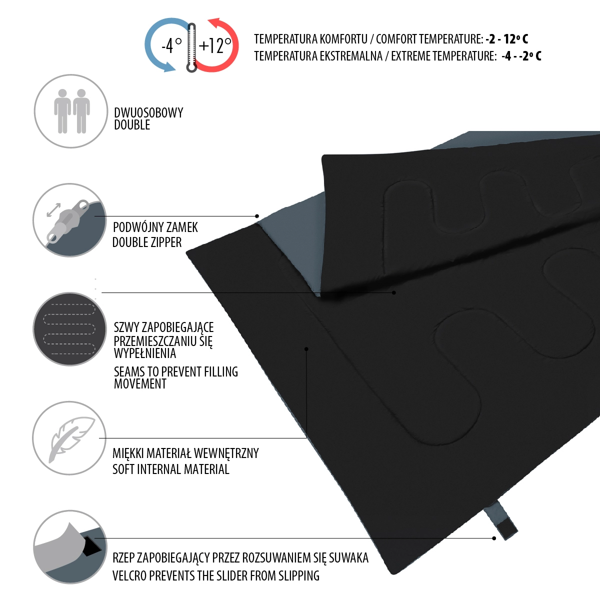 Dvostranska zadrga poteka ob strani in spodnjem delu, zato lahko po popolnem razpetju spalno vrečo uporabite kot prostorno odejo. Široka manšeta z ježkom preprečuje samodejno odpenjanje med spanjem. Praktičen podaljšek na eni strani služi kot podhlavnik za udobnejšo oporo glave. V paketu je kompresijska vreča z vrvico za enostavno prenašanje na rami.