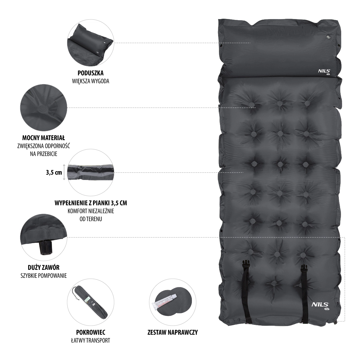 Uživajte v udobnem spancu na poti s samonapihljivo blazino NILS Camp v temno sivi barvi. Zahvaljujoč notranji peni z odprtimi porami se po odprtju ventila sama napolni z zrakom, vi pa jo le na hitro dopihate do želene trdote. Trpežen material poliester 190T s PVC premazom zagotavlja dolgo življenjsko dobo tudi na neravnih podlagah, vgrajen podglavnik poveča udobje, praktični pritiskači ob straneh pa omogočajo spajanje več blazin v eno veliko površino. Priloženi so tudi set za popravilo ter kompresijski trakovi z vrečo za enostavno prenašanje. Idealna za kampiranje, pohodništvo in potovanja z avtomobilom. Samonapihljiv sistem, trpežen material 190T + PVC, vgrajen podglavnik, možnost spajanja blazin.