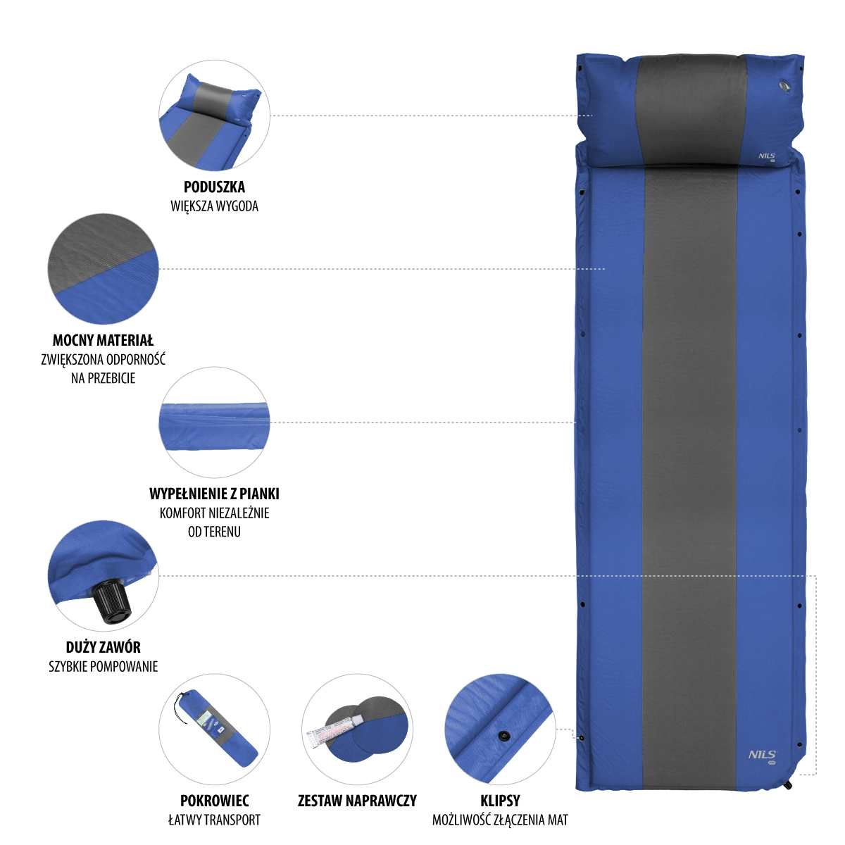 Uživajte v udobju na poti z blazino, ki se po odprtju ventila sama napihne, končno trdoto pa preprosto prilagodite z nekaj vdihi. Konstrukcija iz PU pene z odprtimi porami zagotavlja dobro izravnavo terenskih neravnin in toplotno izolacijo, medtem ko integriran vzglavnik nudi naravno oporo vratni hrbtenici.