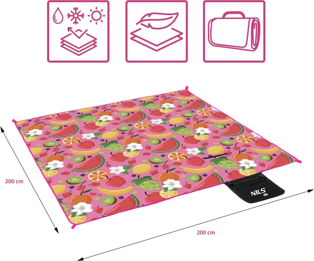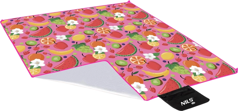 Piknik odeja NILS Camp Fruits je idealna za piknike, plažo, vrt in festivale. Zgornji mehak flis je prijeten na dotik, srednja penasta polnitev poveča udobje sedenja, spodnja plast iz PE z aluminijastim nanosom pa zanesljivo ščiti pred mrazom in vlago. Zaradi dimenzij 200 × 200 cm nudi udobje celotni družini.