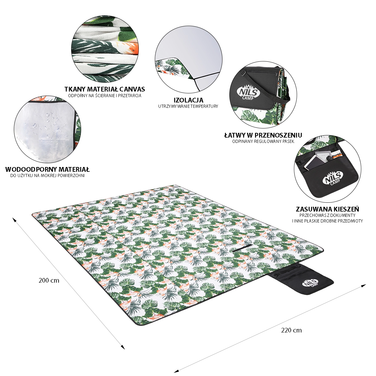 - Velik format – 200 × 220 cm za družinske piknike in sprostitev.