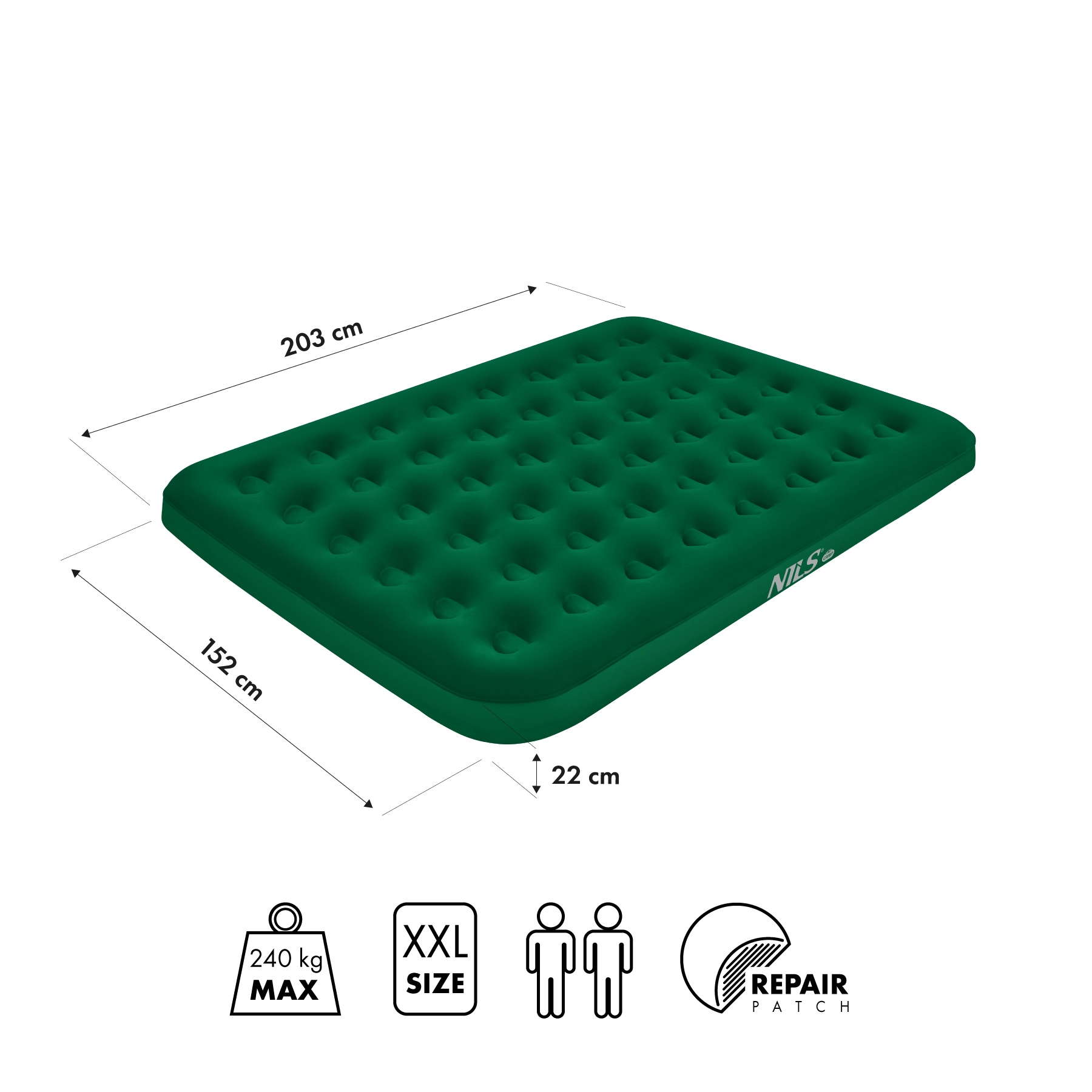 Udobna napihljiva blazina NILS Camp ponuja mere 203 × 152 × 22 cm za prijeten spanec doma in na poti. Zahvaljujoč odpornemu PVC, visoki nosilnosti 240 kg in višini 22 cm odlično izolira pred mrazom in neravninami. Dvojni ventil omogoča hitro napihovanje in izpihovanje z usti ali ročno, nožno oziroma električno črpalko.