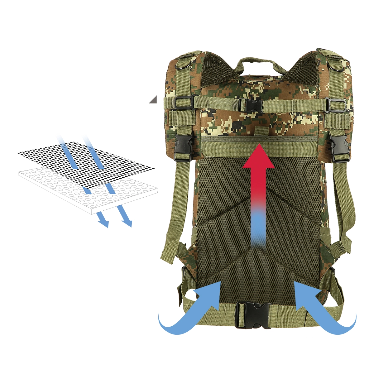 - Nastavljive, oblazinjene naramnice + prsni in ledveni pas