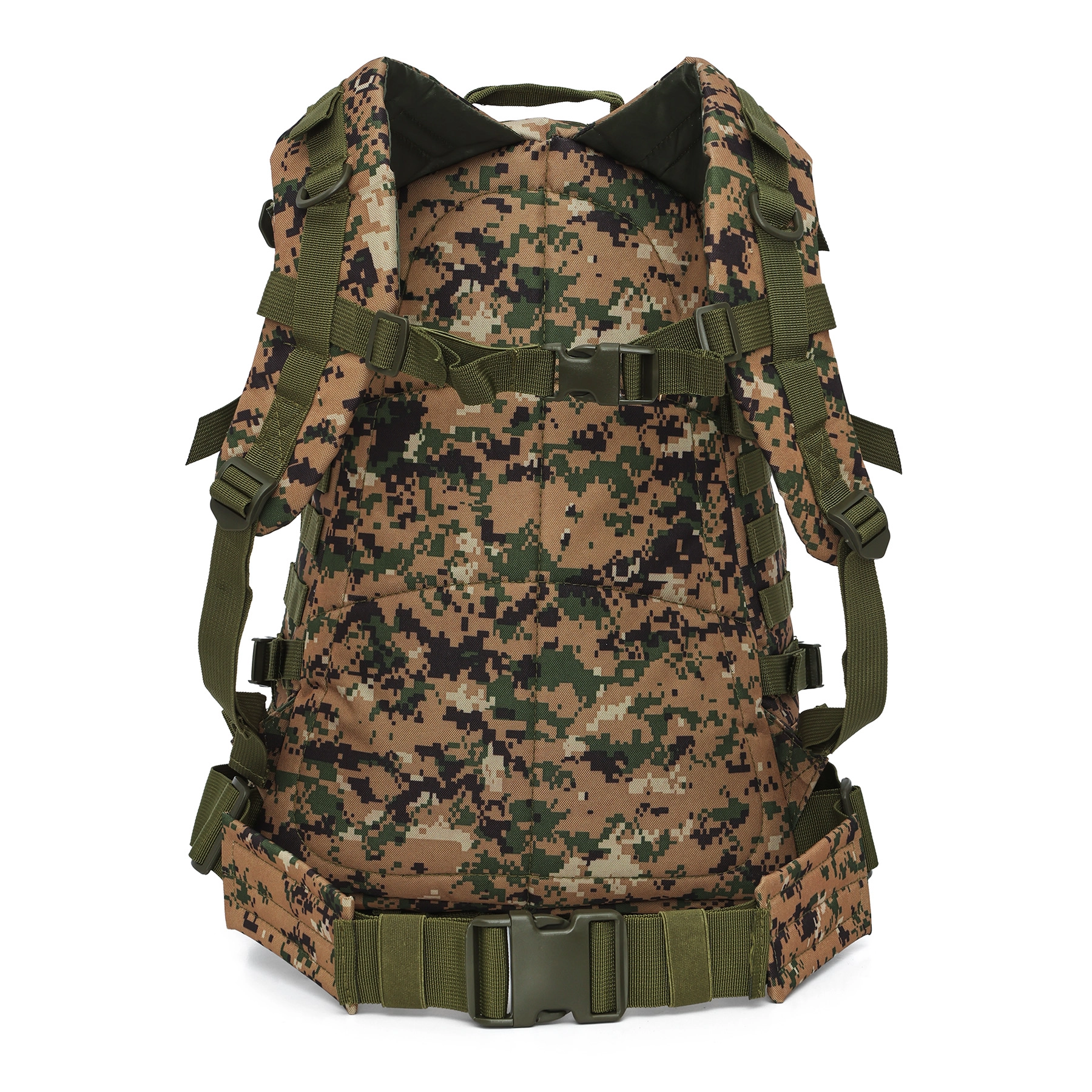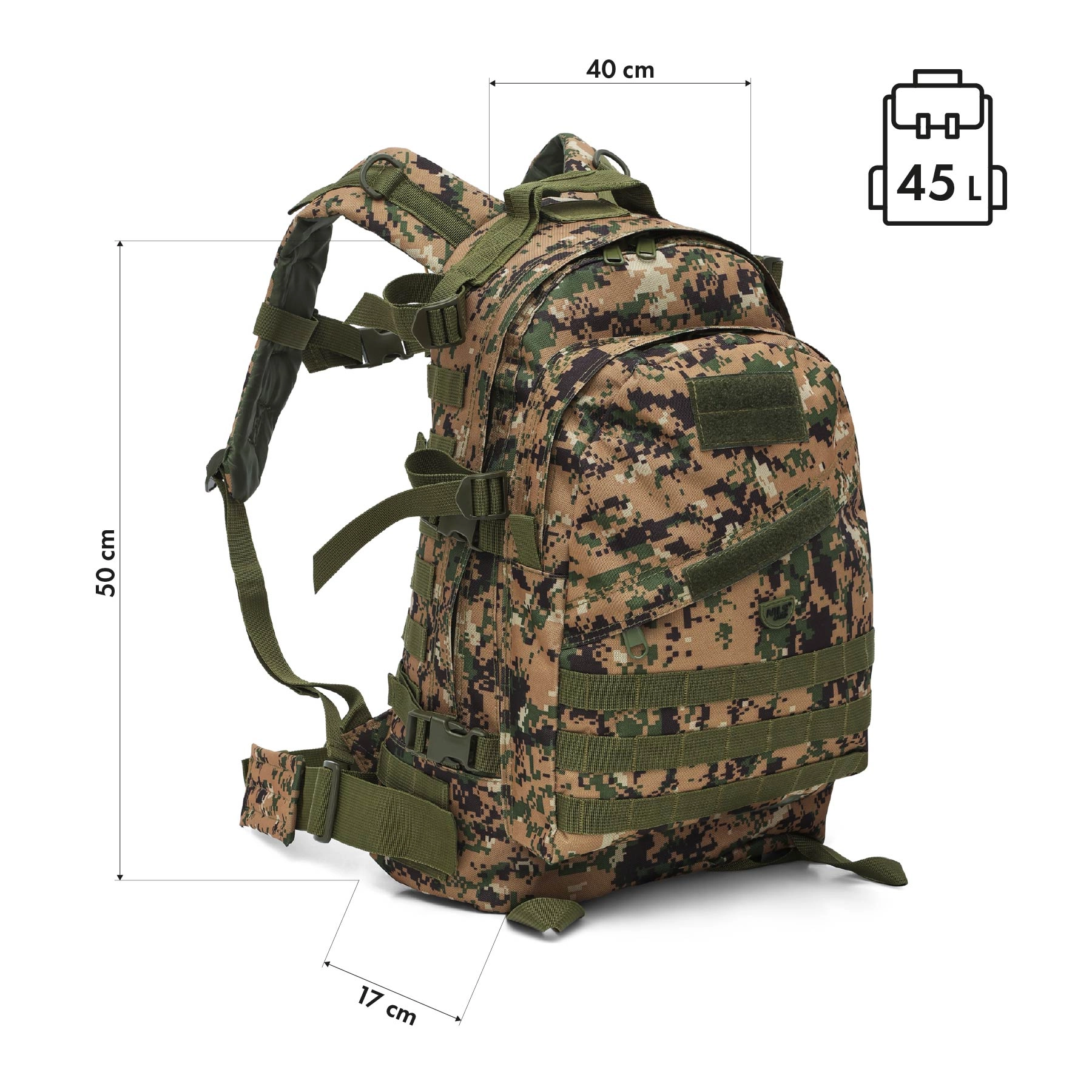 Ta maskirni nahrbtnik združuje funkcionalnost, nizko težo in taktičen dizajn. Material iz trpežnega poliestra s PVC premazom ter notranjo podlogo 210D ščiti vsebino pred obrabo in vlago, medtem ko teža le 1 kg zagotavlja udobno vsakodnevno uporabo.