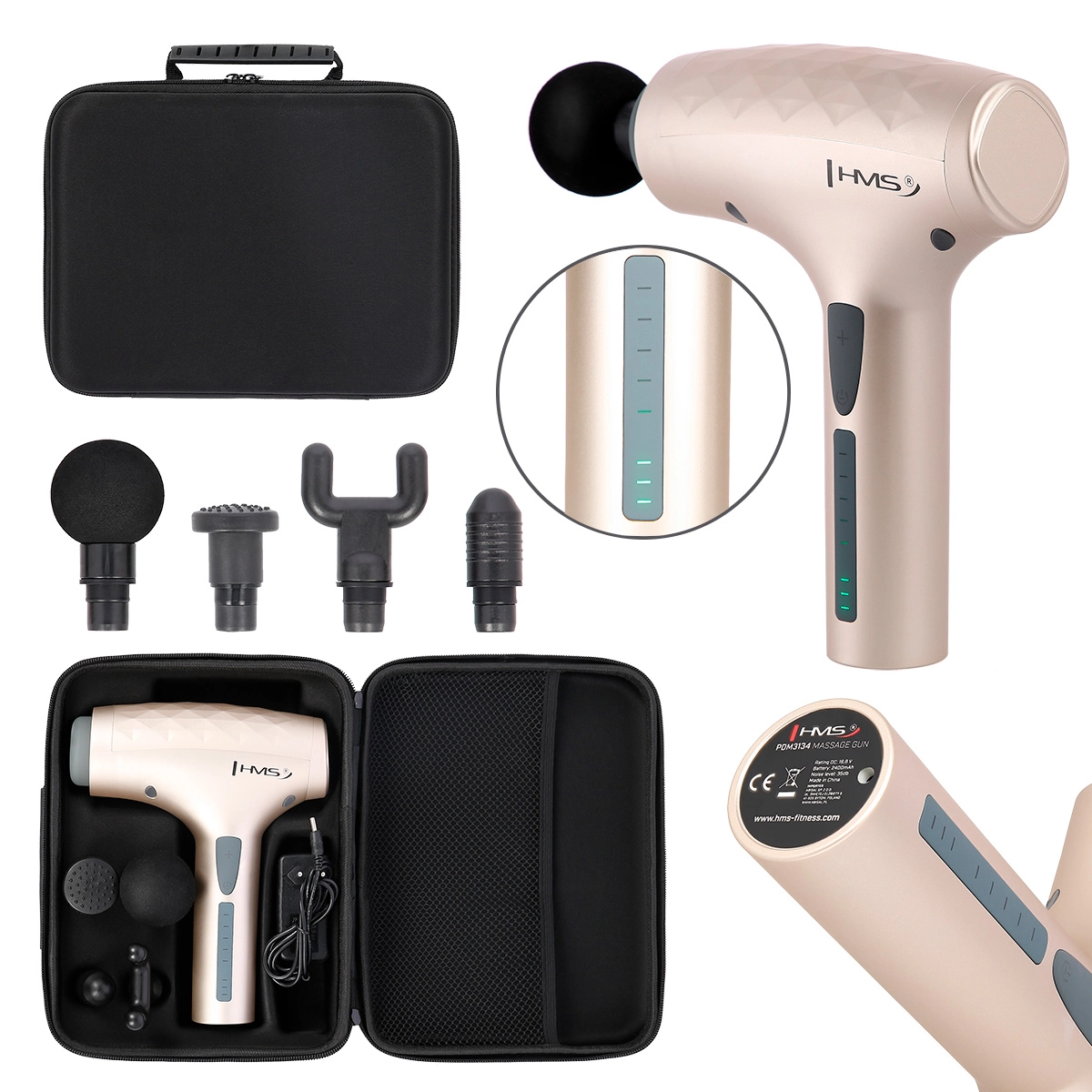 - masažna pištola, polnilni adapter, 4 konice, transportni kovček