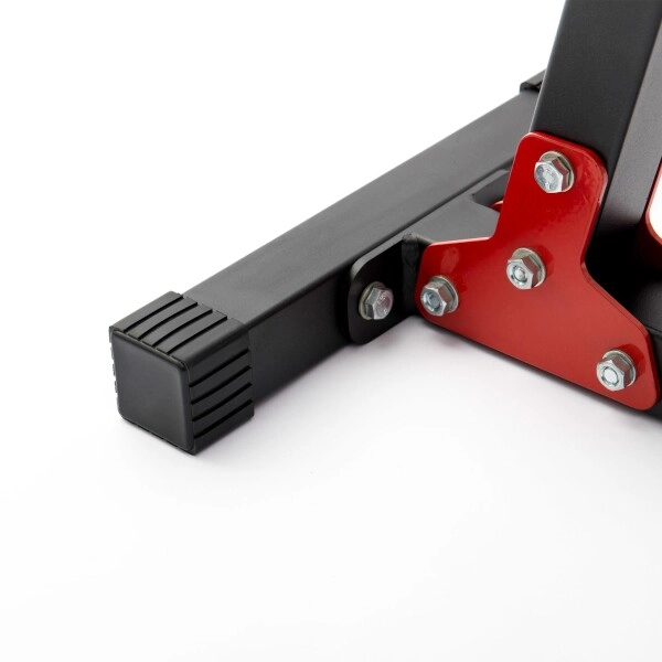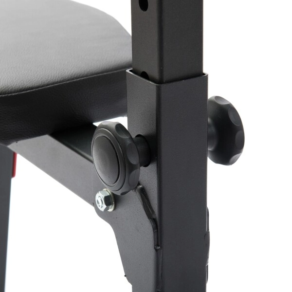 Ergonomsko oblikovano oblazinjenje iz kakovostnega sintetičnega usnja z dvojnimi šivi nudi udobje tudi pri zahtevnem treningu. Odlagalni kavlji z grobo zaščitno gumo zmanjšujejo hrup in preprečujejo praske na osi ter konstrukciji. Praškasto lakirana površina ščiti okvir pred obrabo in korozijo, gumijaste nogice pa držijo klop trdno na mestu brez poškodb tal.