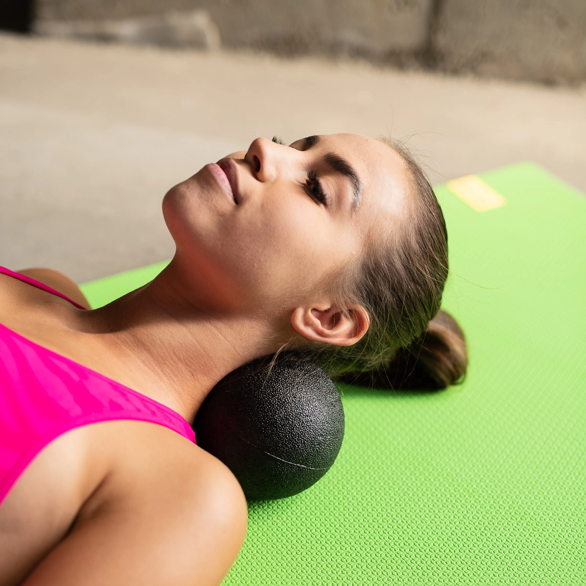 Postavite valjček pod zatilje in z nežnim gibanjem sprostite mišične vozle. Idealno pri dolgotrajnem sedenju in po vadbi.