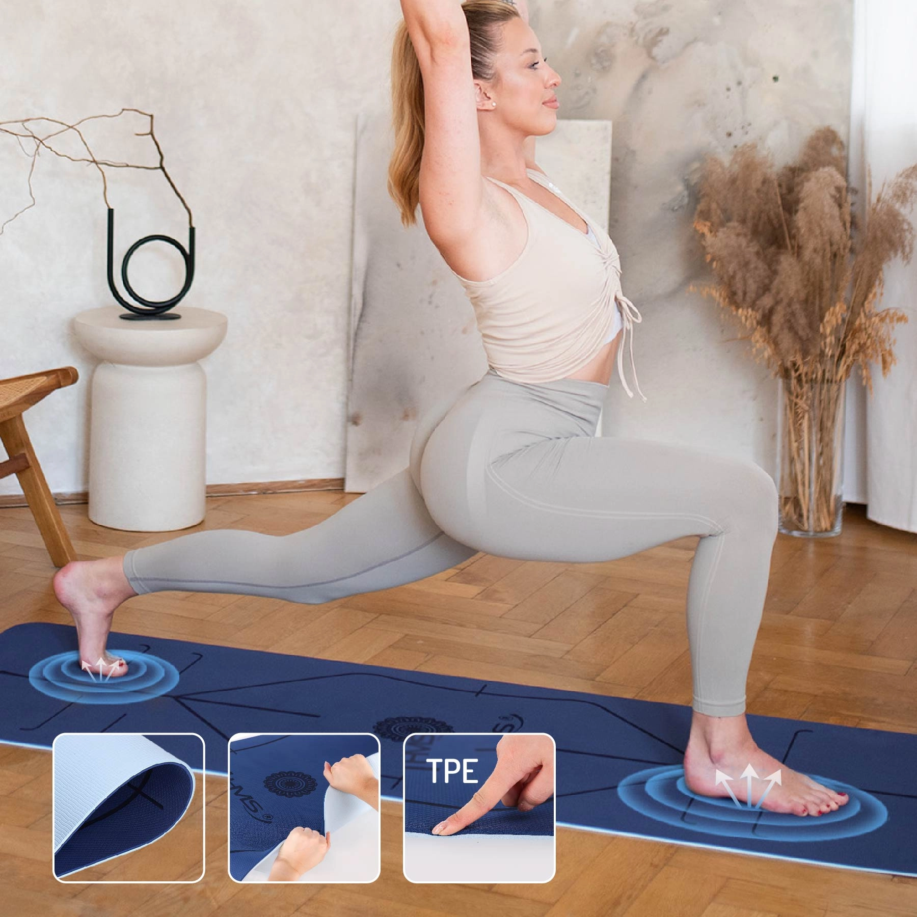 Teksturirana TPE površina zagotavlja zanesljiv oprijem in mehko blaženje, ki ščiti sklepe pri jogijskih položajih, pilatesu in dinamičnem treningu.