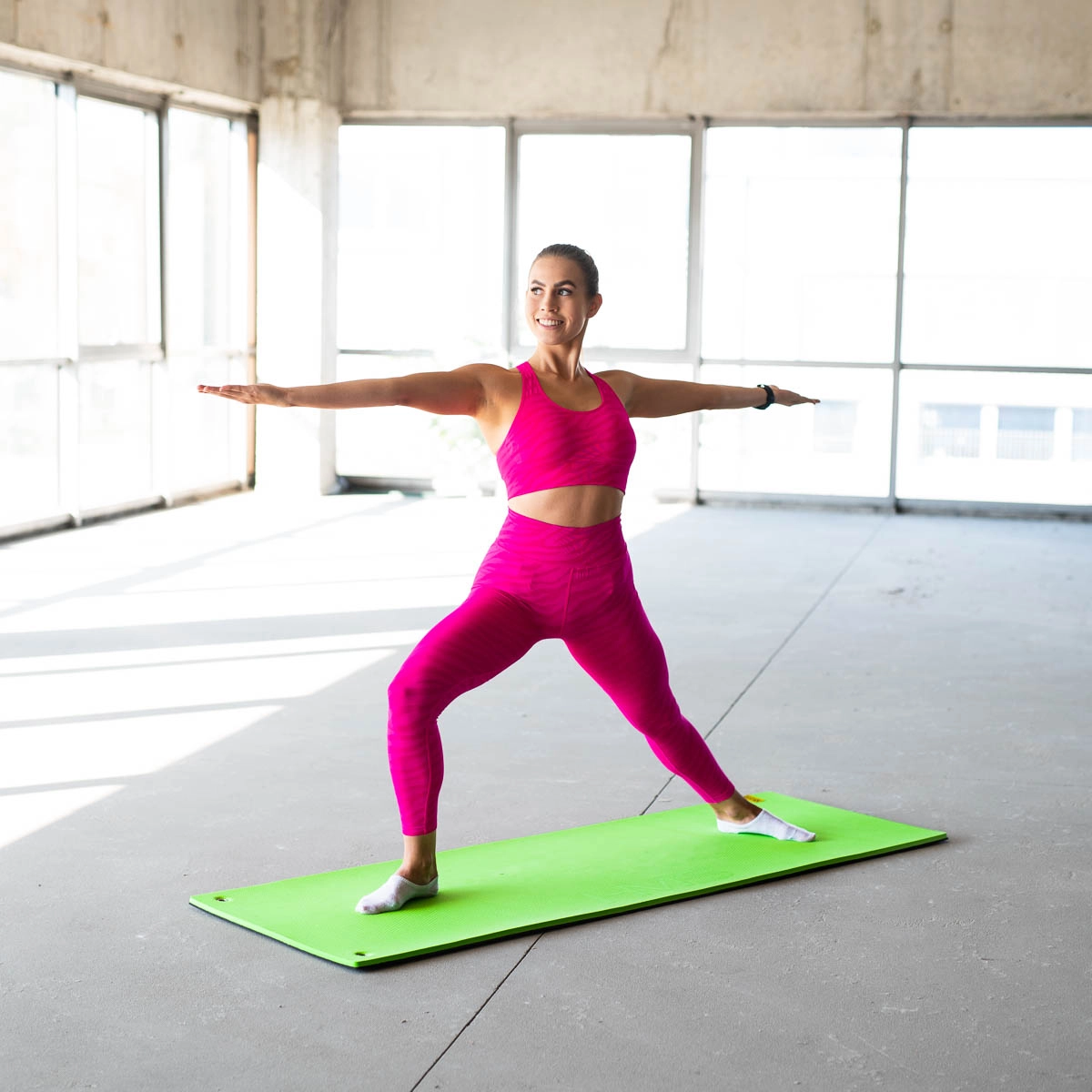 Teksturirana površina zagotavlja zanesljiv oprijem pri statičnih položajih in dinamičnem treningu – idealno za jogo, pilates, raztezanje in vadbo moči.