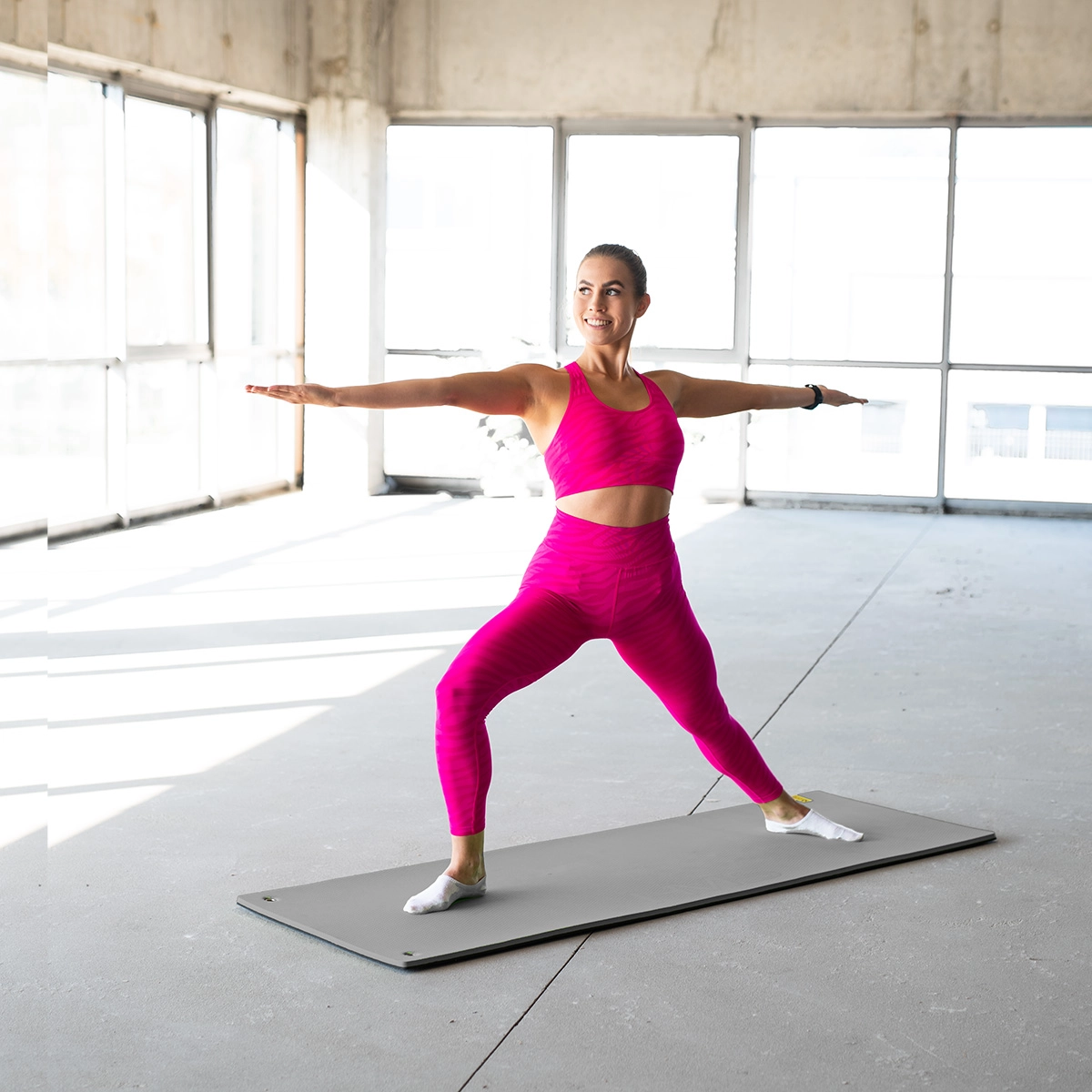 Teksturirana površina in oprijemljiva spodnja plast držita podlogo na mestu, da je vaš gib zanesljiv in varen tudi pri dinamični vadbi.