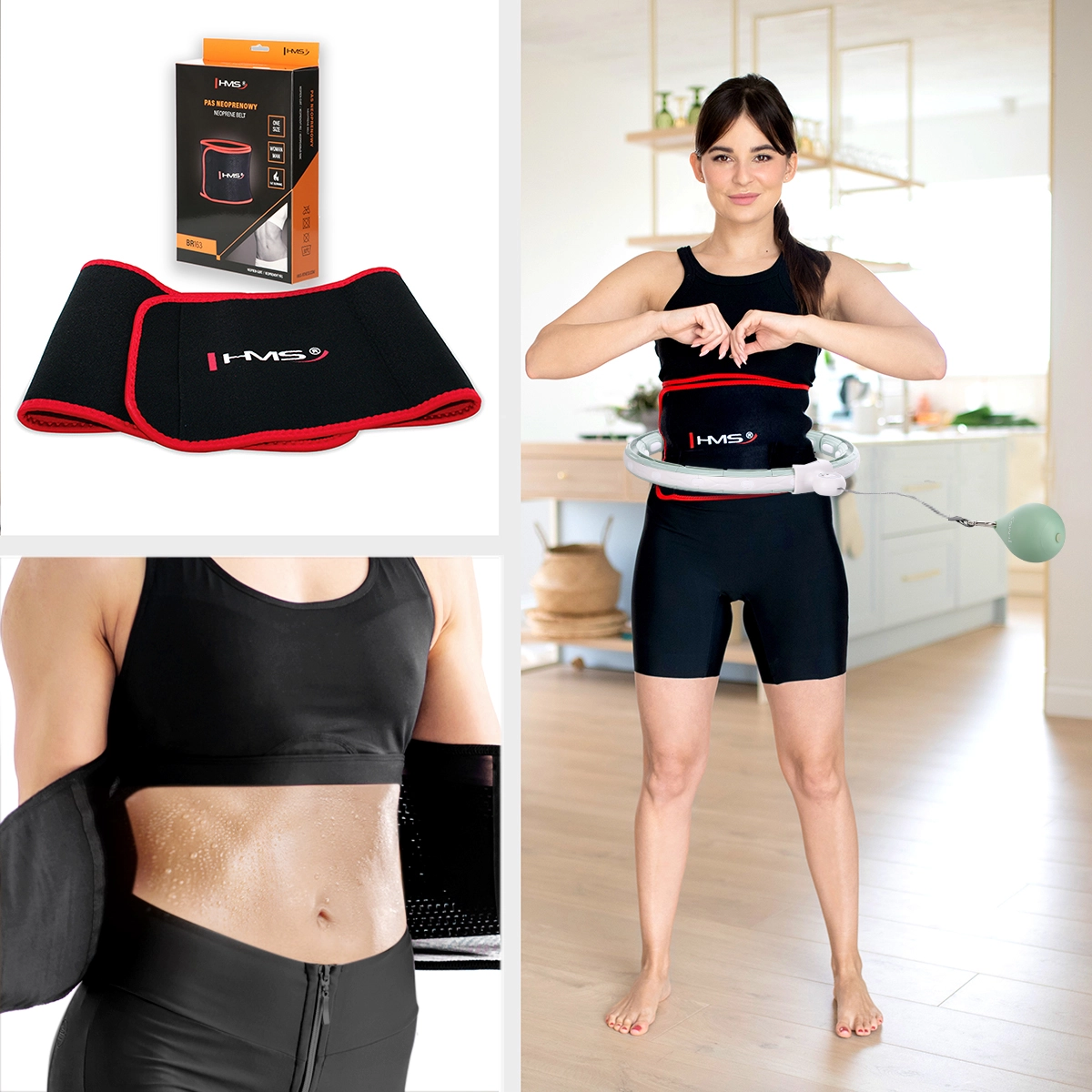 Pas HMS BR163 z elastičnim neoprénom in ježkom zvišuje temperaturo na predelu pasu, spodbuja potenje in nudi oporo med treningom in čez dan.