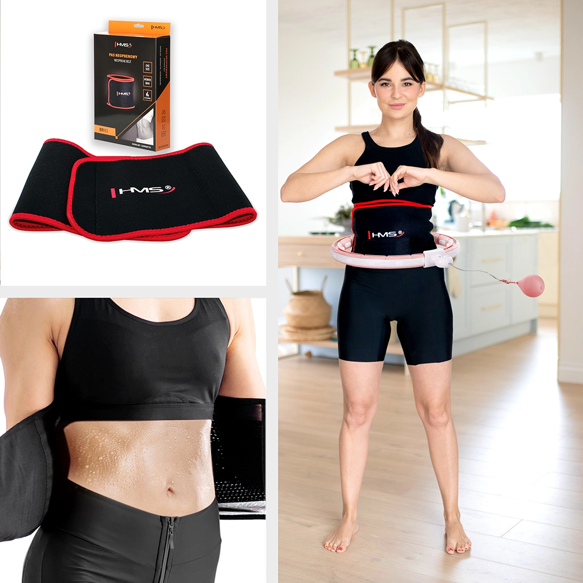 Popoln domači komplet za oblikovanje postave: pametni masažni hula hoop HMS HHM15 z nastavljivim obsegom, magnetnimi izboklinami, vrtečo utežjo in LCD števcem dopolnjuje neoprenasti shujševalni pas HMS BR163 za intenzivnejše potenje in podporo pri kurjenju kalorij.