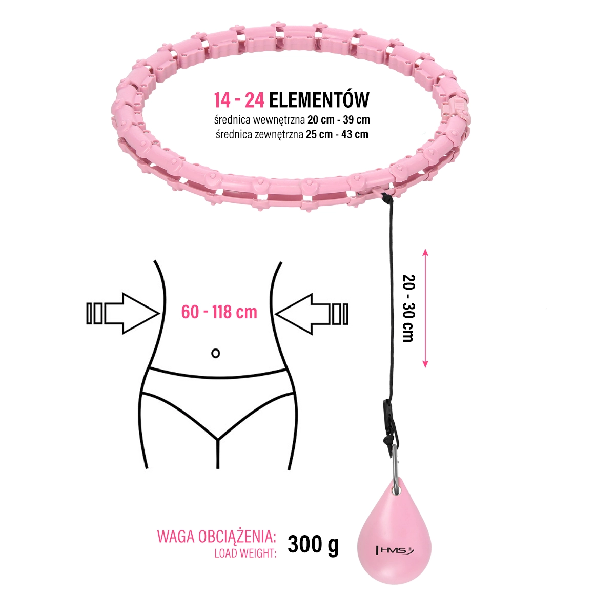 HMS HHW02 je sodoben hula hoop obroč z nastavljivo dolžino in vrtečo utežjo težko 300 g, ki poveča intenzivnost vadbe. Zložljiva konstrukcija iz 24 delov omogoča enostavno prilagoditev obsega pasu (60–118 cm). Notranje masažne blazinice prijetno stimulirajo področje trebuha in pasu, medtem ko gladko gibanje zmanjšuje obremenitev hrbta in kolkov.